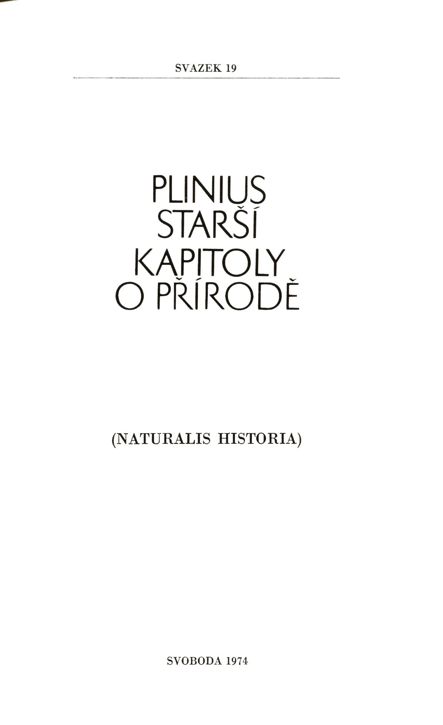 Kapitoly o přírodě / Plinius Starší ; vybral, přeložil, předmluvou, vysvětlivkami a seznamem vlastních jmen doplnil František Němeček ; obálka, vazba a grafická úprava Lea Novotného. -- Praha : Svoboda, 1974. -- Rudé právo. -- 352 stran ; 21 cm. -- (Antická knihovna ; svazek 19). -- Barevná zdobená obálka. - Plátěná vazba s ražbou. - Na přední záložce obálky anotace. - 27 750 výtisků. -- Resumé: Český překlad Přírodní historie, životního díla "nejučenějšího Římana prvního století n. l.", podává průřez touto rozsáhlou encyklopedií věd a umění, čítající 37 knih. Těměř v úplnosti byla přeložena 2., 7. a 35. kniha, v nichž Plinius pojednává o vesmíru, o přírodních úkazech, o zvláštnostech lidí a národů a o výtvarném umění. Z ostatních knih byly uveřejněny pouze výňatky nebo výstižné obsahy. -- ISBN : (Vázáno).