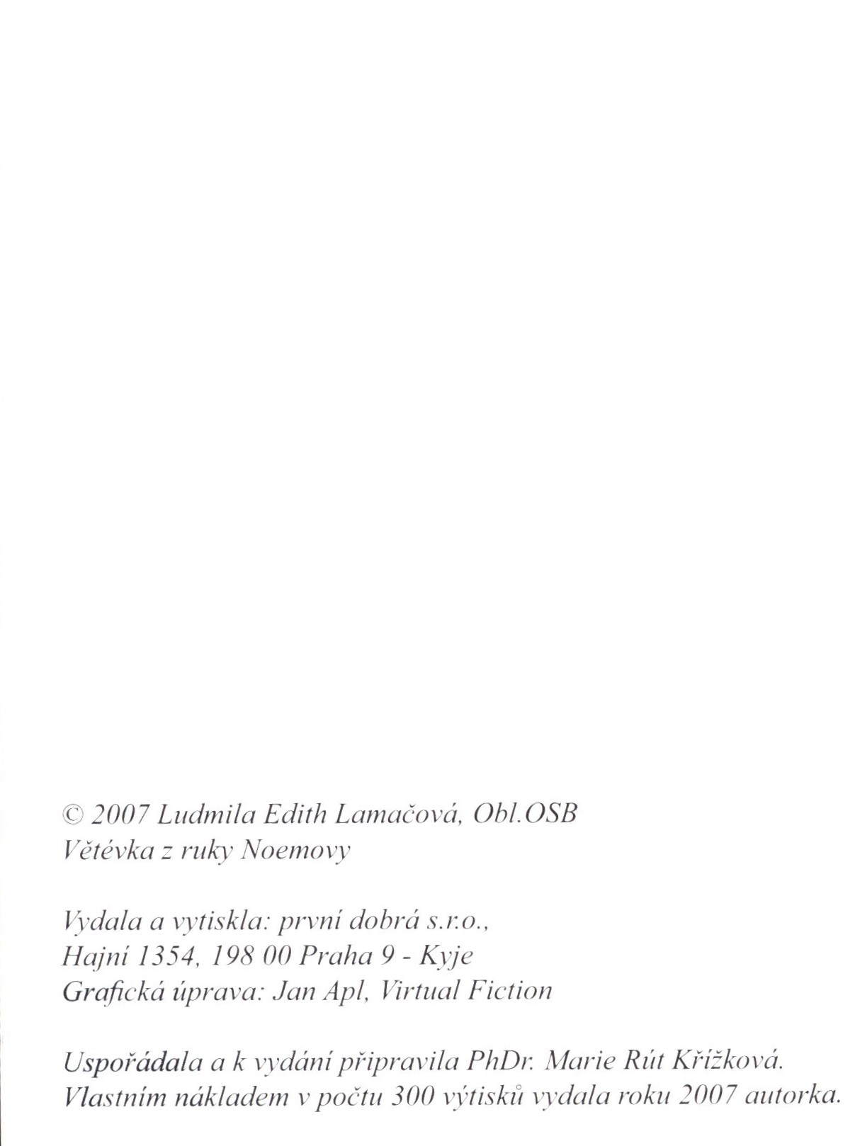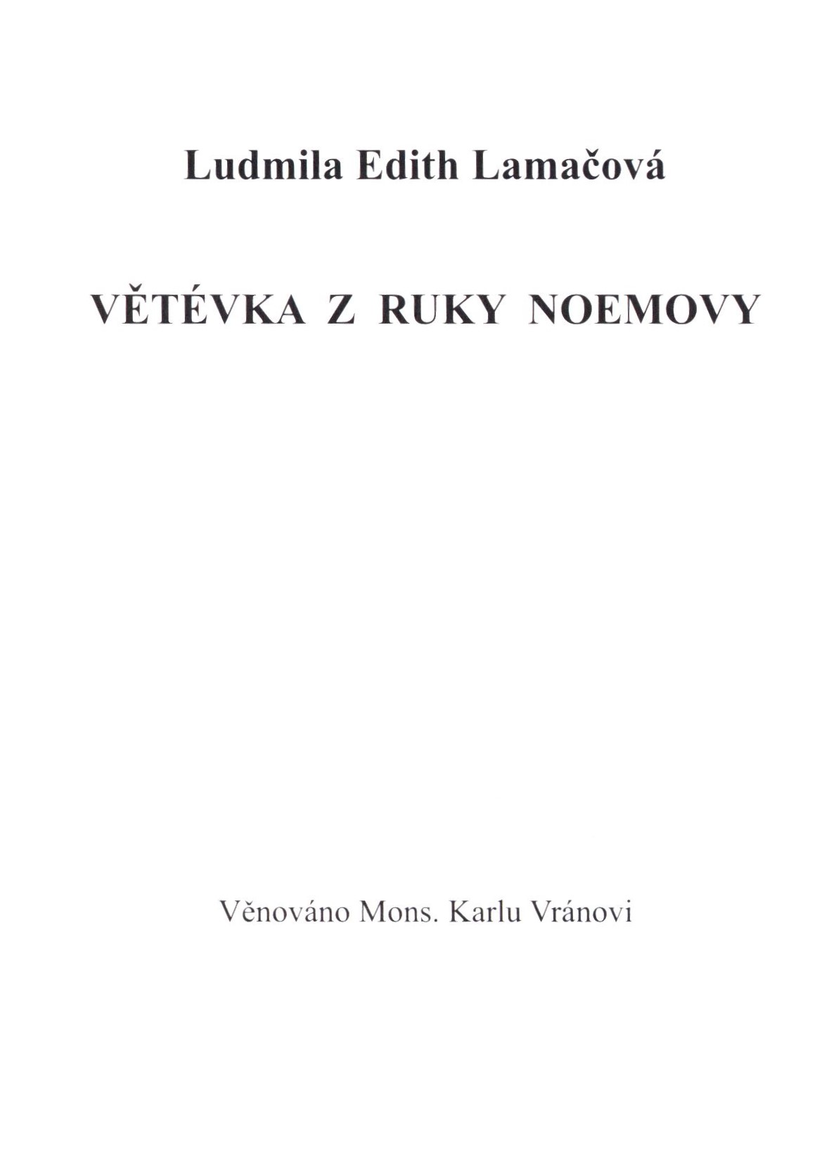Větévka z ruky Noemovy : Věnováno Mons. Karlu Vránovi / Ludmila Edith Lamačová ; grafická úprava Jan Apl ; uspořádala a k vydání připravila Marie Rút Křížková. -- Praha : První dobrá s.r.o., [2007]. -- ©2007. -- První dobrá s.r.o. -- 54 stran ; 15 cm. -- Barevná zdobená obálka. - Na zadní straně obálky bio-bibliografická informace o autorce. - 300 výtisků. -- ISBN : (brožováno).