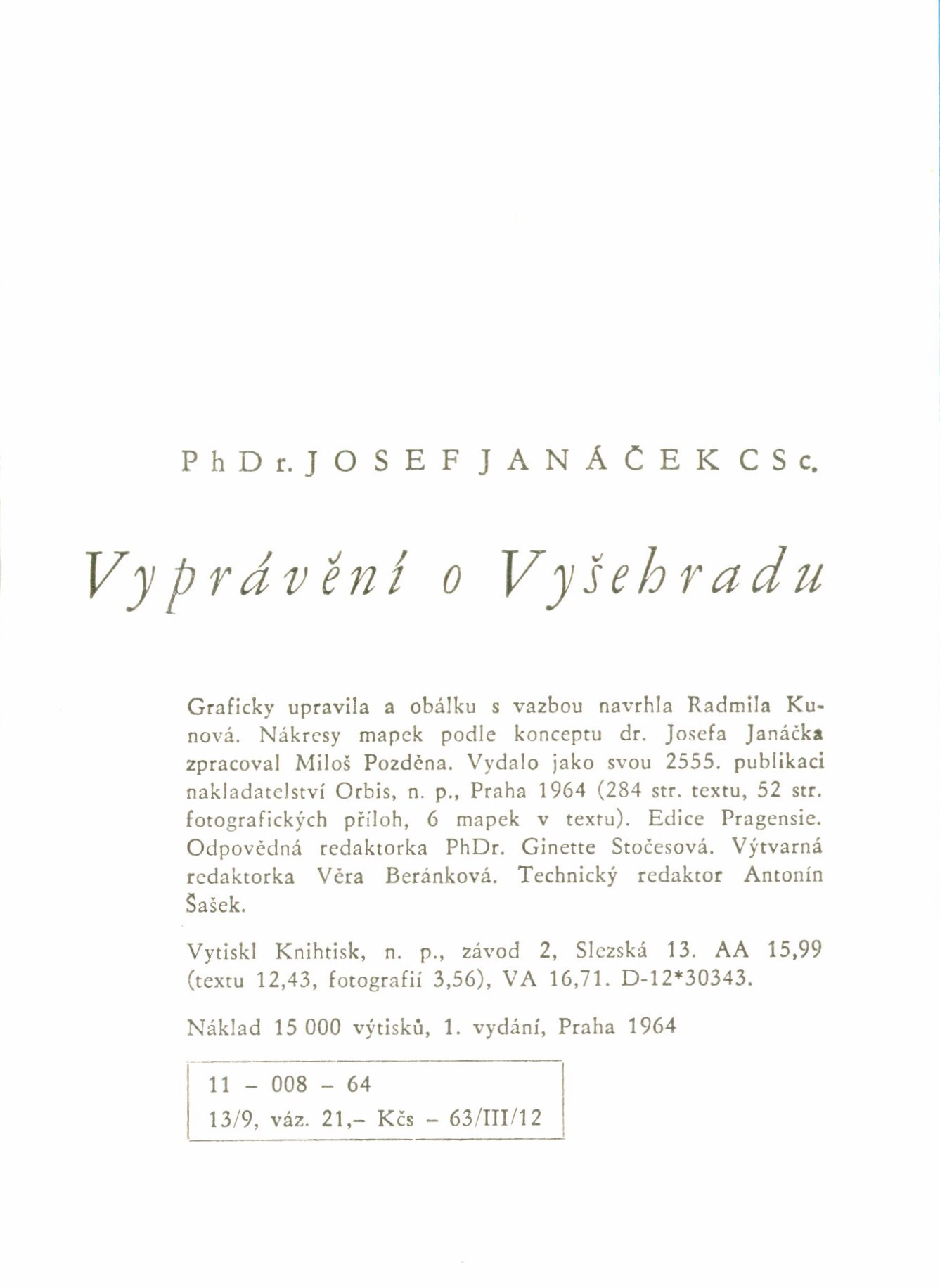 Vyprávění o Vyšehradu / Josef Janáček ; graficky upravila a obálku s vazbou navrhla Radmila Kunová ; nákresy mapek podle konceptu dr. Josefa Janáčka zpracoval Miloš Pozděna. -- 1. vydání. -- Praha : Orbis, 1964. -- Knihtisk, n.p. -- 283 stran, 52 nečíslovaných stran obrazových příloh : ilustrace, plány ; 17 cm. -- (Pragensie). -- Barevná zdobená obálka. - Šedá plátěná vazba s ražbou. - Dvoustránkový titulní list s ilustrací. - Černobílé ilustrace a plány. - 15 000 výtisků. -- Resumé: Knížka vychází od pověstí o počátcích a prvních dobách Vyšehradu, kriticky je rozebírá a hodnotí, aby odlišila ověřitelné skutečnosti od pouhých smyšlenek. Na základě pramenného materiálu dále zachycuje osudy památného místa až do nové doby, všímá si i jeho inspirační síly na české umění a vyprávění uzavírá stručným průvodcem po místě a jeho památkách. -- ISBN : (Vázáno).