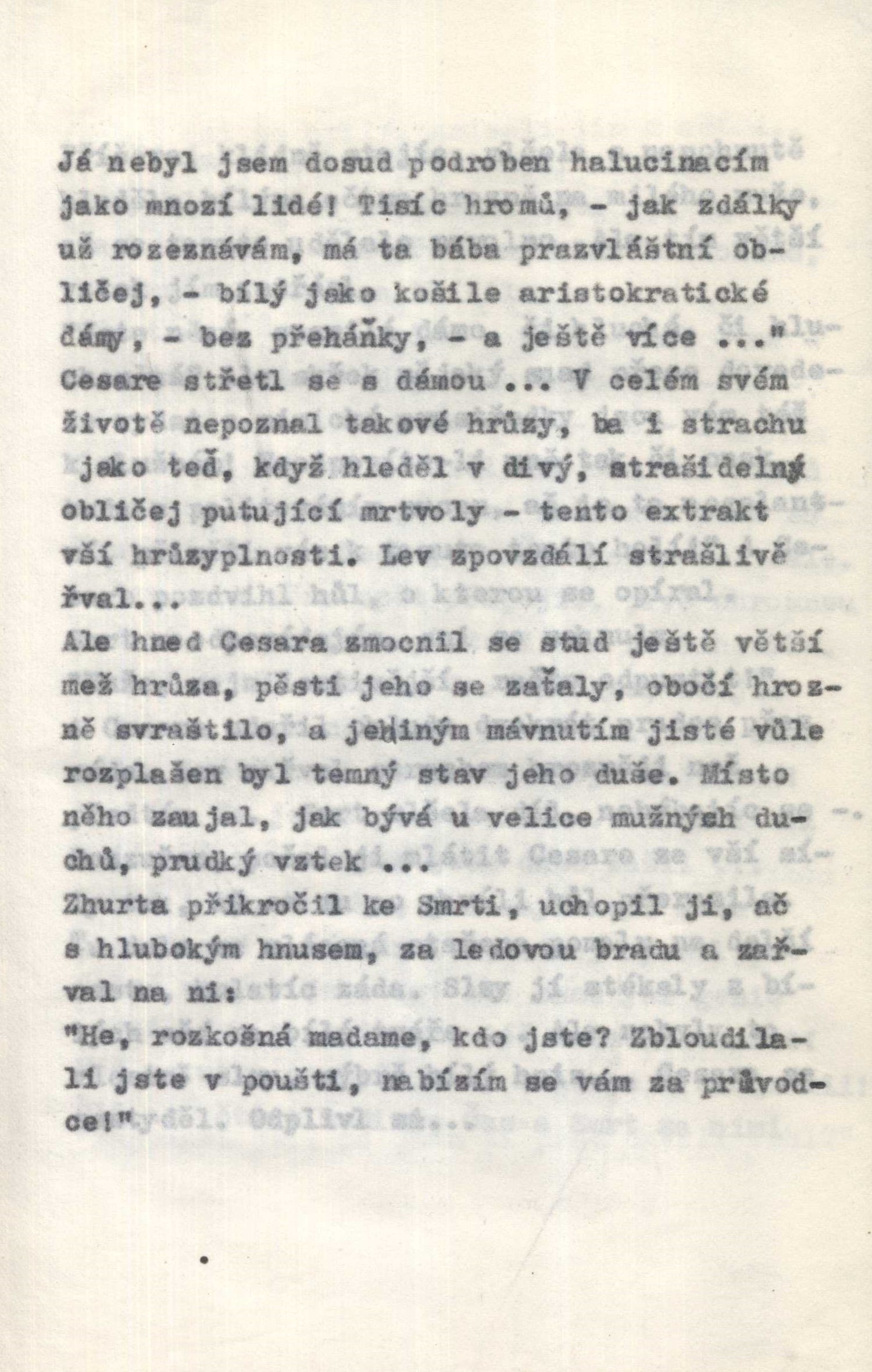 $a [Praha] : $b samizdat ; $c 1984-1989 300 $a 16 nečíslovaných listů ; $c 23 cm 336 $a text $b txt $2 rdacontent 337 $a bez média $b n $2 rdamedia 338 $a svazek $b nc $2 rdacarrier 500 $a Kartonová obálka polepená hnědě batikovanou kanavou. - Na přední předsádce přilepen ručně malovaný černošedý papír. - Černošedý malovaný titulní list, černě psaný text. - Průklepový papír se strojopisným textem na jedné straně. - Na zadní předsádce přilepený ručně malovaný papír (černošedostříbrný). 520 $a Ve svém díle často používal hororové prvky zombií, strašidel a přízraků - řada jeho knih je tak řazena do literatury science fiction. Tato povídka je s mystickými prvky. 653 1-