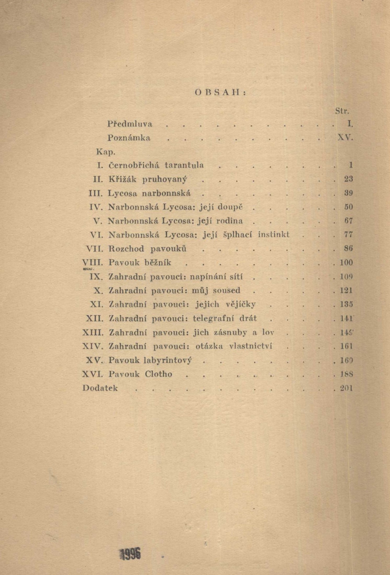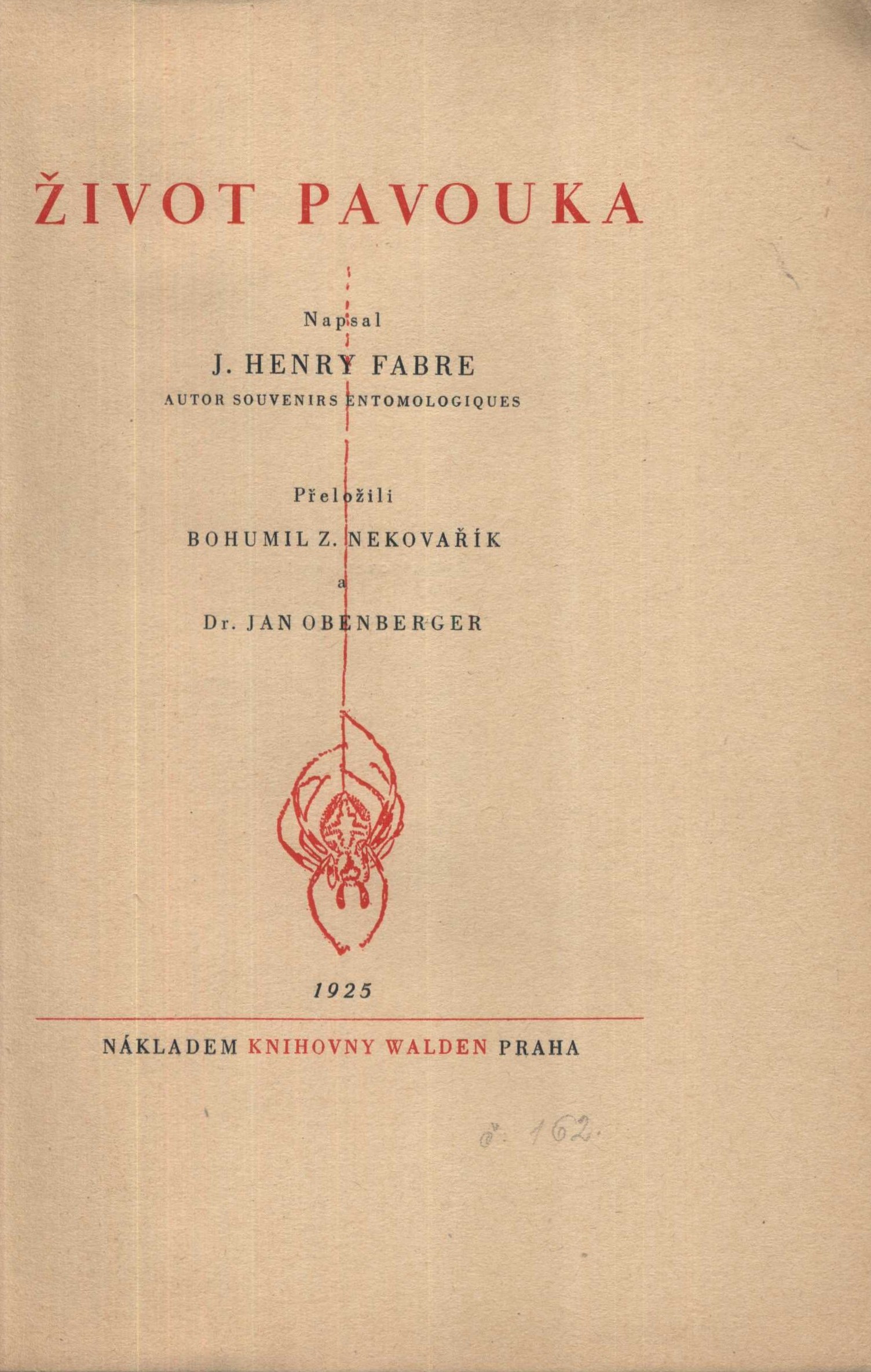 Knihovna Walden (B. Z. Nekovařík)Země vyd. Česko Jazyk dok. čeština Jazyk orig. francouzština Poznámky Žlutá obálka s ilustrací sítě a pavouka, dvoubarevný text (i na hřbetu). - Patitul s černobílou ilustrací. - Na místě frontispisu údaje o edici, ediční značka. - Dvoubarevný text a drobná ilustrace na titulním listu. - Tónovaný portrét J.H. Fabreho. - Předmluva "Básník hmyzu" M. Maeterlinck. - Poznámka B.Z. Nekovařík. - Texty. - Tónované fotografie s popisky na křídovém papíře. - Černobílé ilustrace. - Dodatek. - Obsah. - Na zadní straně obálky ediční značka.