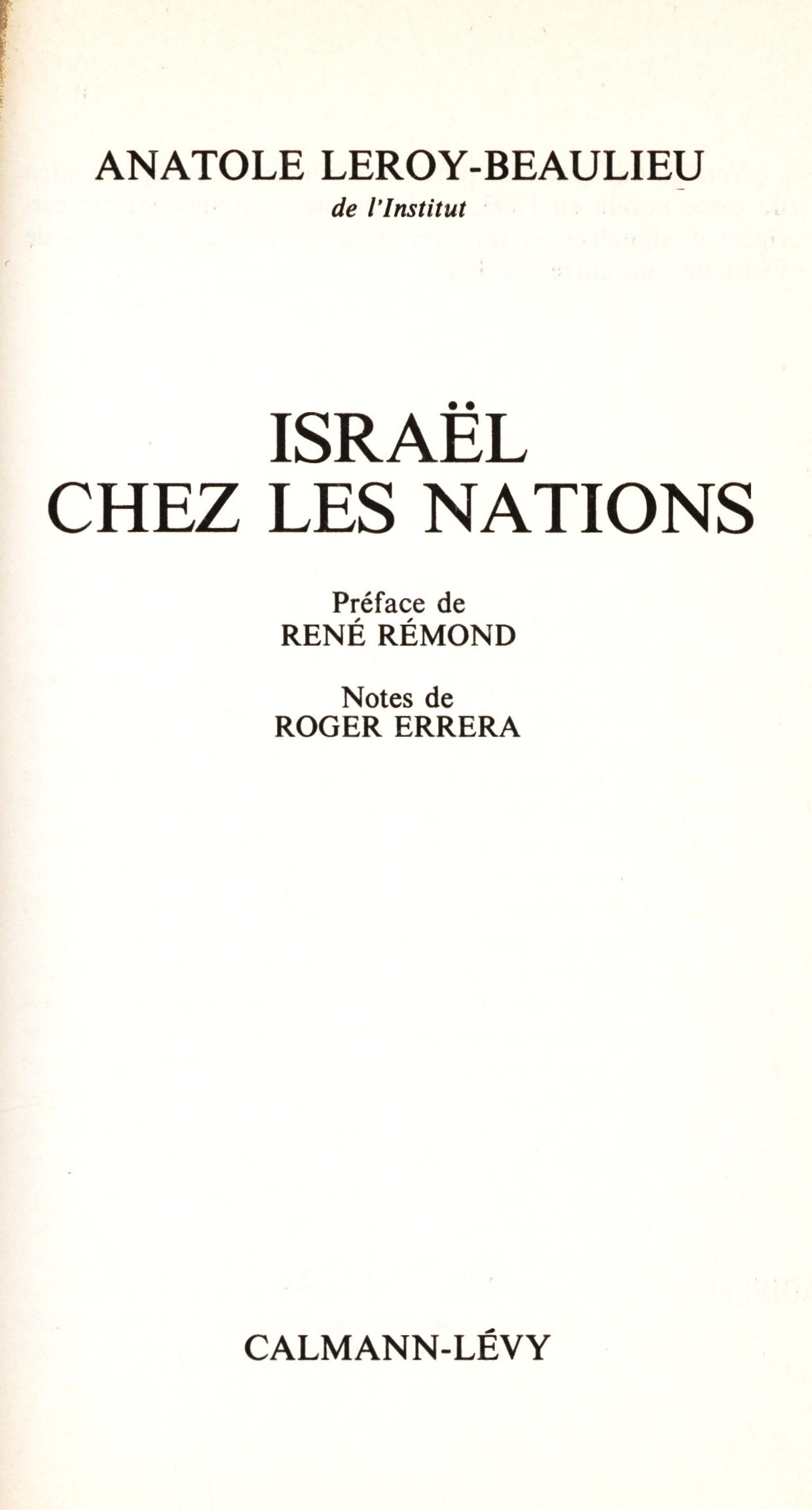 Israël chez les nations / Anatole Leroy-Beaulieu ; Préface de René Rémond ; Notes de Roger Errera. -- Paris : Calmann-Lévy, 1983. -- Mayenne : Floch. -- 350 stran ; 21 cm. -- (Collection Diaspora). -- Dvoubarevná typografická obálka. - Černobílý titulní list. - Poznámky pod čarou. - Obsah. - Ediční upoutávka. -- Obsahuje bibliografické odkazy. -- ISBN : 2-7021-1222-6 (brožováno).