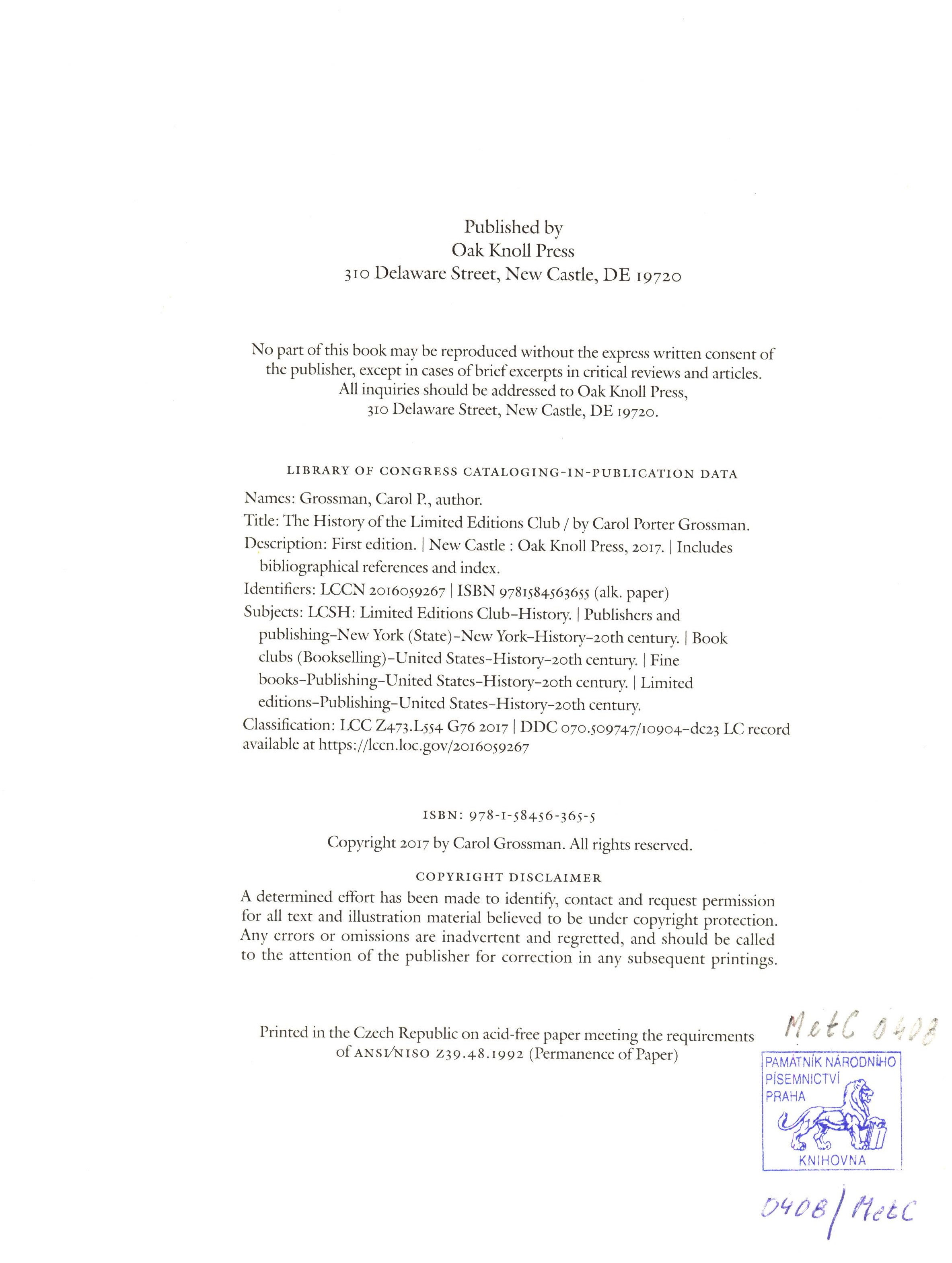 The History of the Limited Editions Club / by Carol Porter Grossman. -- First edition. -- New Castle : Oak Knoll Press, 2017. -- Czech Republic [Příbram] : PB Tisk. -- 268 stran : barevné ilustrace, reprodukce ; 29 cm. -- Historie Klubu limitovaných edic. - Pevná poloplátěná vazba bez přebalu zdobená edičními značkami. - Frontispis s portrétem George Macyho. - Zdobený titulní list. - Obsah. - Seznam ilustrací. - Vysvětlení. - Úvod. - Poznámky na konci kapitol. -- Obsahuje bibliografii a rejstřík. -- Resumé: George Macy založil Limited Editions Club s podporou investorů v době rozkvětu akciového trhu v roce 1929. Po získání zakládajících předplatitelů a spolupracovníků a přípravě počáteční série 12 titulů byla první kniha odeslána během týdne kolapsu akciového trhu. Příběh o tom, jak Klub limitovaných edic přežil jako kombinace knižního klubu a kvalitního tisku/nakladatelství přes více než 80 let vzestupů a pádů, je fascinující a až dosud nebyl pořádně vyprávěn. -- ISBN : 978-1-58456-365-5 (vázáno).