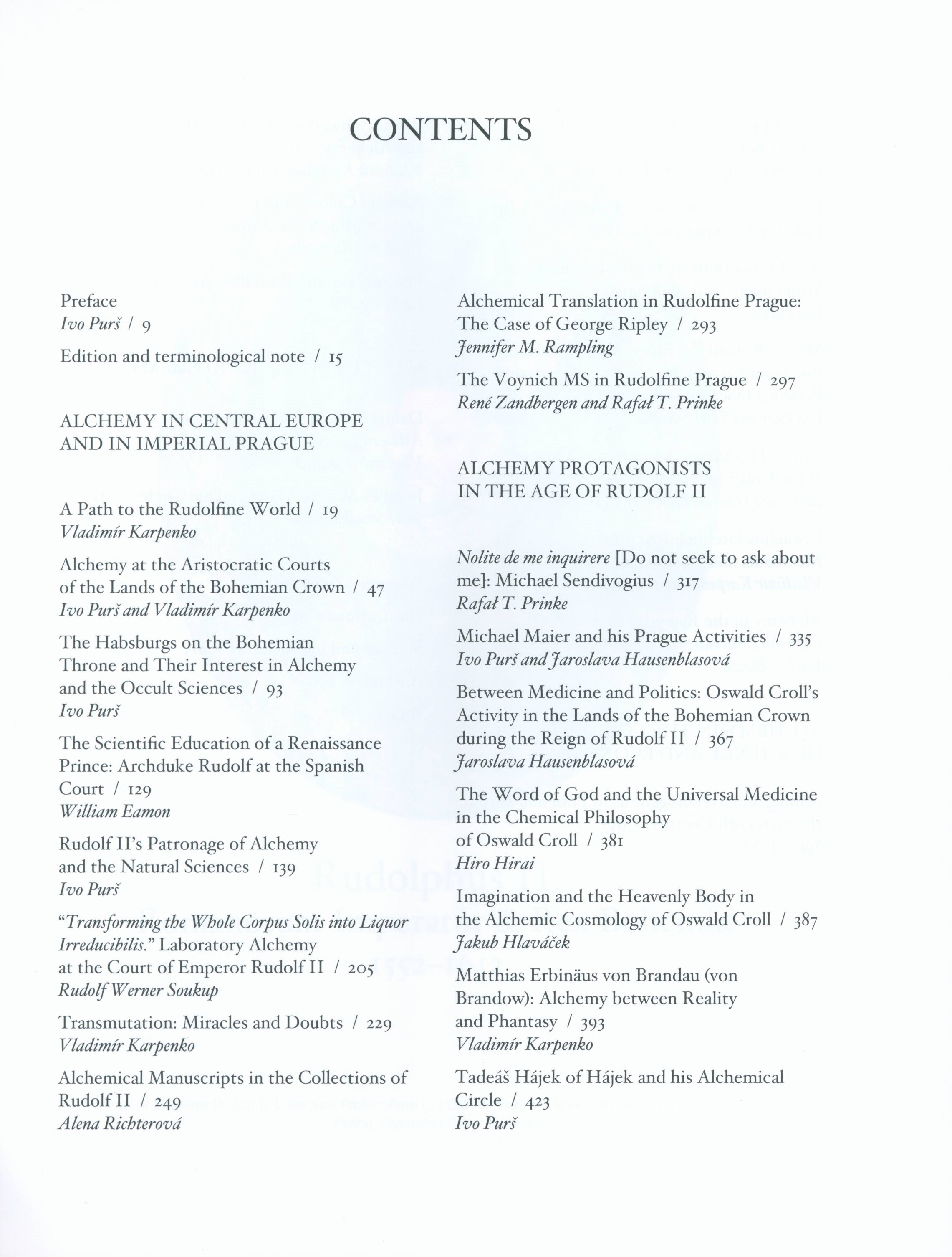 AnotacePublikace se zabývá jak aktivitami, jež byly přímo podporovány císařem Rudolfem II., tak i těmi, které se rozvíjely v širším společenském okruhu spojeném s císařským dvorem. Ten nesahal jen do českých zemí, ale i do Rakouska a oblastí Římsko‑německé říše. Časově je dané téma vymezeno dobou vlády Rudolfa II. v letech 1576 až 1611, avšak pro pochopení jeho kontextu je nezbytné poukázat i na vývoj alchymických bádání ve střední Evropě zhruba od počátku 16. století, stejně jako je důležité sledovat vývoj jeho dozvuků v 17. století.