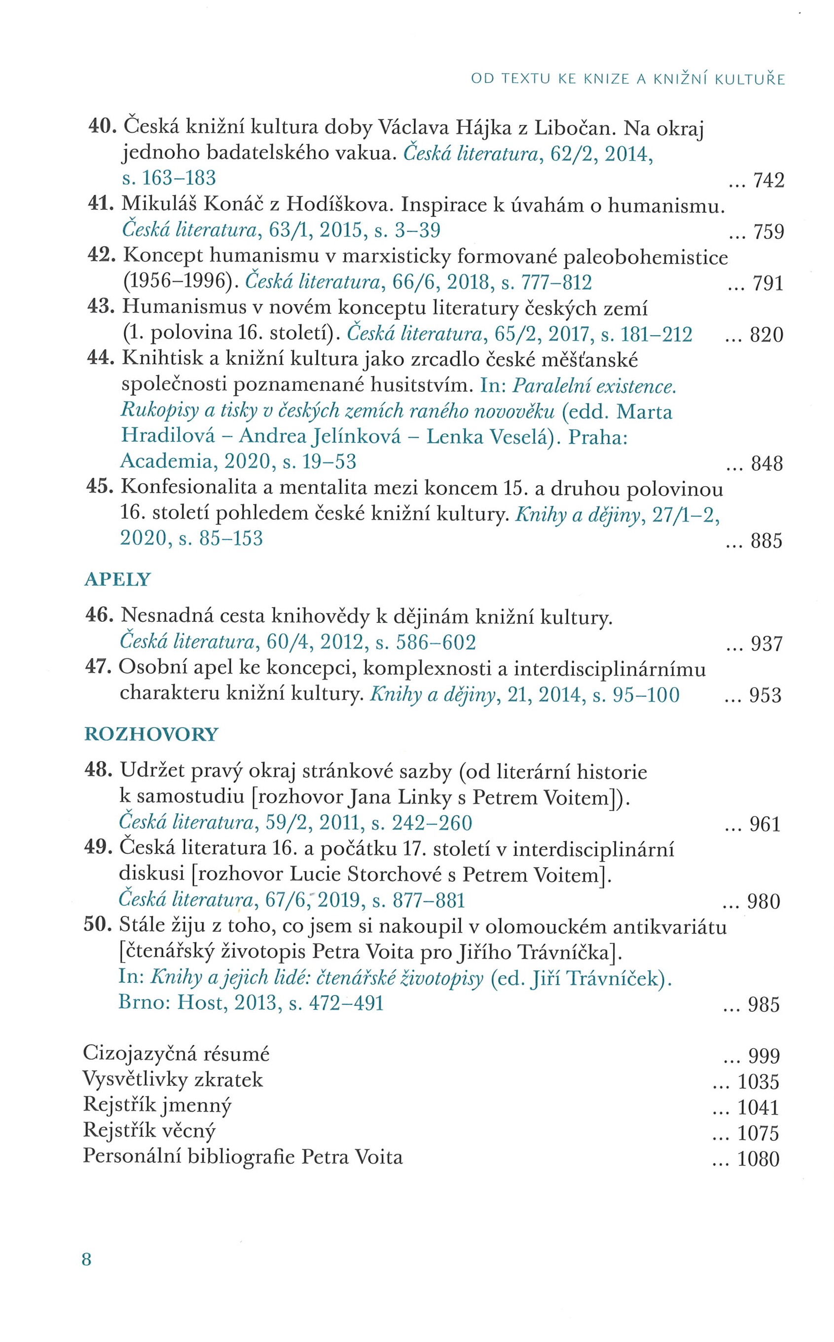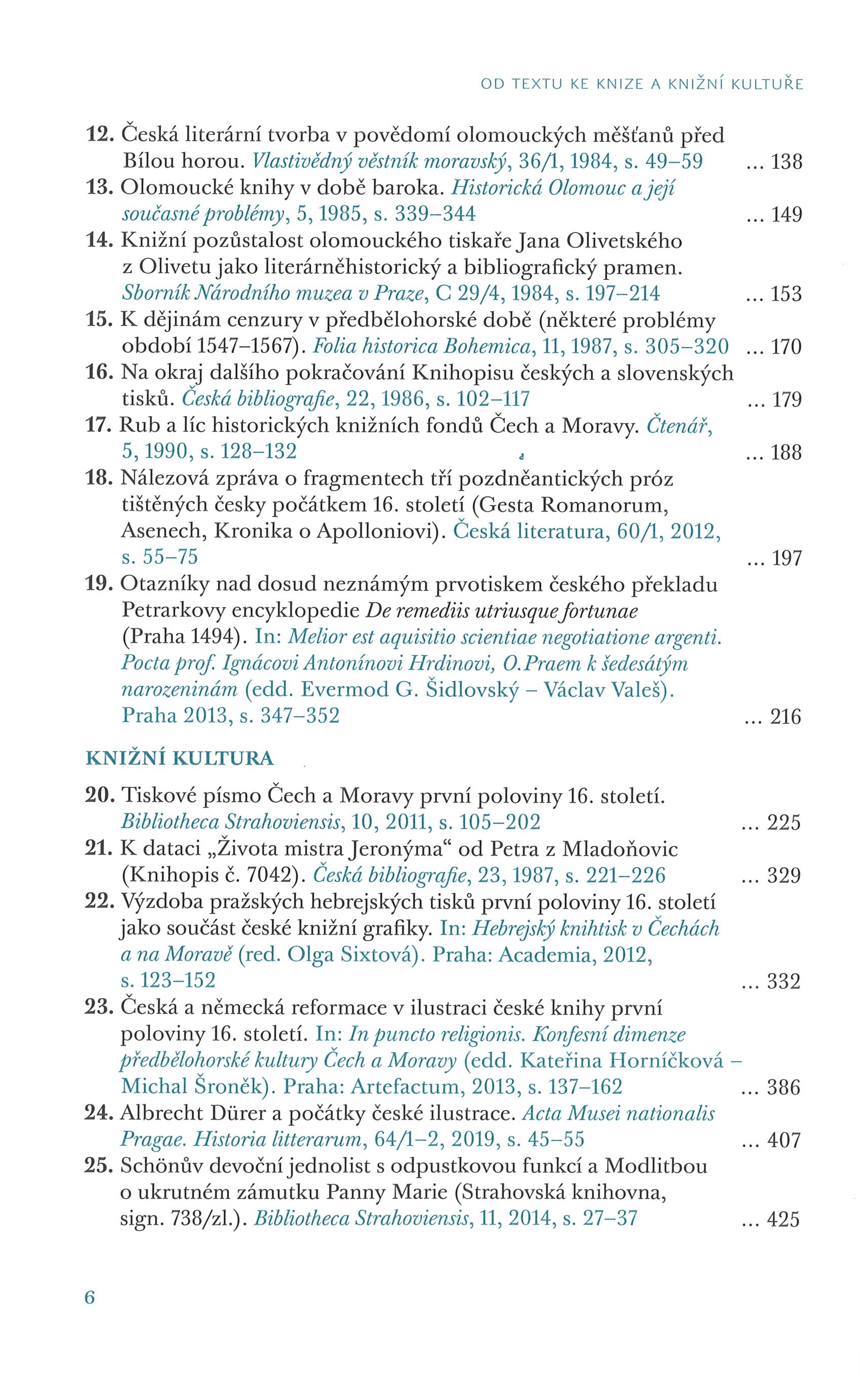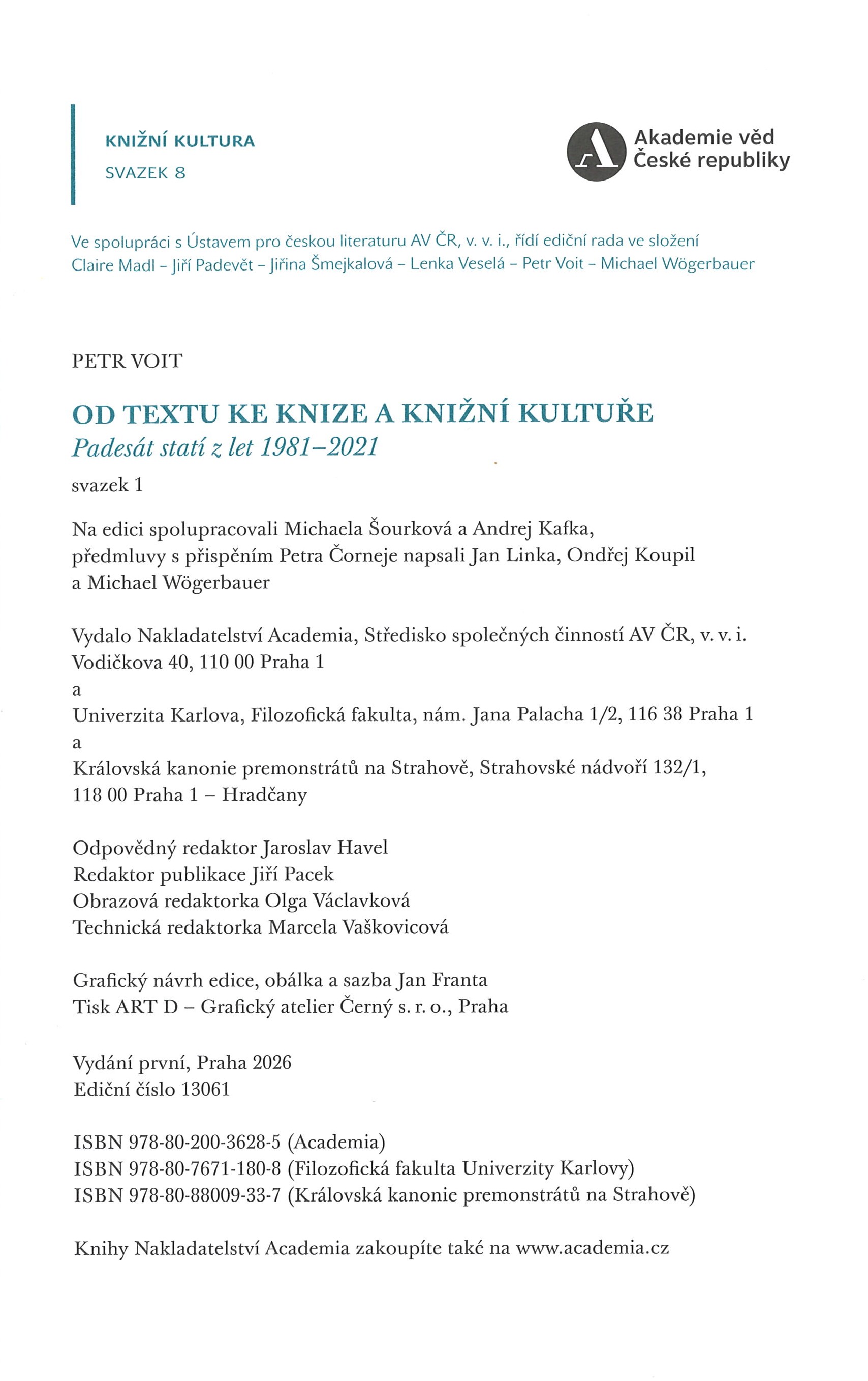 Názvové údaje Od textu ke knize a knižní kultuře : padesát statí z let 1981-2021. Svazek 1 / Petr Voit ; na edici spolupracovali Michaela Šourková a Andrej Kafka ; předmluvy s přispěním Petra Čorneje napsali Jan Linka, Ondřej Koupil a Michal Wögerbauer ; grafický návrh edice, obálka a sazba Jan Franta Osobní jméno Voit, Petr, 1956- (Autor) Další autoři Šourková, Michaela (Jiná role) Kafka, Andrej (Jiná role) Čornej, Petr, 1951- (Jiná role) Linka, Jan, 1971- (wfw) Koupil, Ondřej, 1972- (wfw) Wögerbauer, Michael, 1972- (wfw) Franta, Jan, 1974- (Knižní grafik) (Výtvarník desky knihy nebo ochranného pouzdra pro dokument) (Sazeč) Korp. Academia (nakladatelství) (Nakladatel, vydavatel) Univerzita Karlova. Filozofická fakulta (Nakladatel, vydavatel) Strahovský klášter (Nakladatel, vydavatel) ART D - Grafický atelier Černý (Tiskař) Údaje o vydání Vydání první Nakladatel Praha : Academia : Karlova univerzita, Filozofická fakulta : Královská kanonie premonstrátů na Strahově, 2026 Výrobce ART D - Grafický atelier Černý s.r.o. Rozsah 491 stran : ilustrace (některé barevné), faksimile ; 24 cm ISBN 978-80-200-3628-5 (Academia ; vázáno) 978-80-7671-180-8 (Karlova univerzita, Filozofická fakulta ; vázáno) 978-80-88009-33-7 (Královská kanonie premonstrátů na Strahově ; vázáno) Edice Knižní kultura ; svazek 8