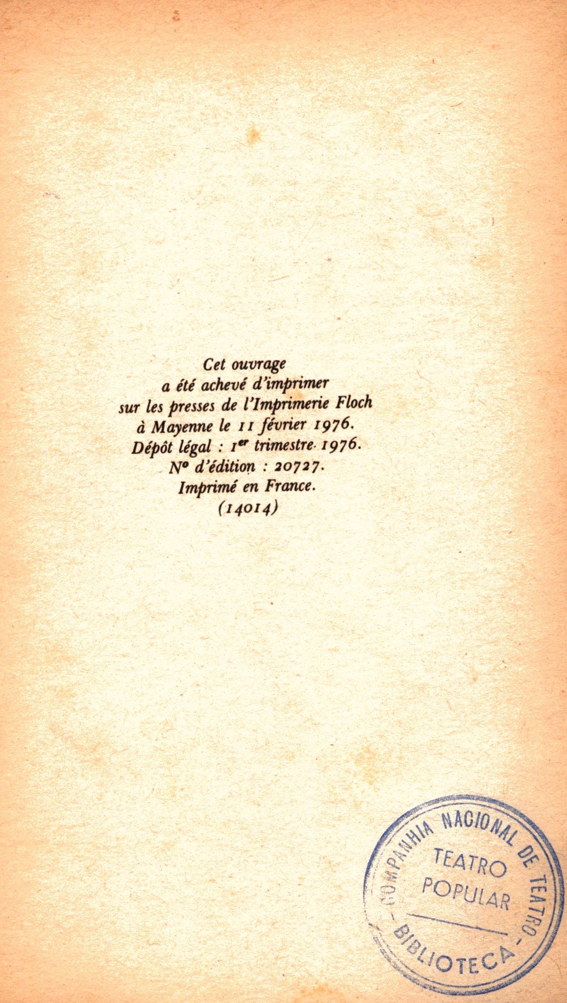 Druh dok. monografie Klíčová slova francouzští spisovatelé * francouzská literatura * francouzsky psaná literatura * drama * divadelní hra MDT 821.133.1-051 * 821.133.1 * 821=133.1 * 82-2 Uživatelské pole PNP Sign. Listopad 730: na několika místech v knize včetně titulního listu je razítko s nápisem začínajícím slovy „COMPANHIA NACIONAL DE TEATRO..." Signatura Přír.číslo Lokace Info Listopad 0730 0457/2026 Sbírka