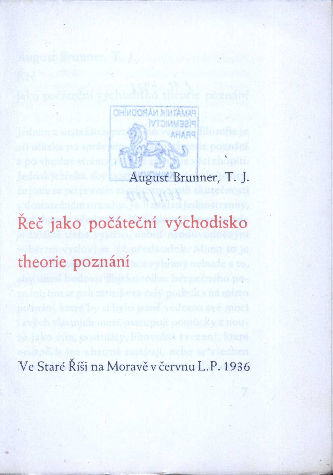 1. Názvové údajeŘeč jako počáteční východisko theorie poznání / August Brunner ; [přeložil Jaroslav Skalický]
