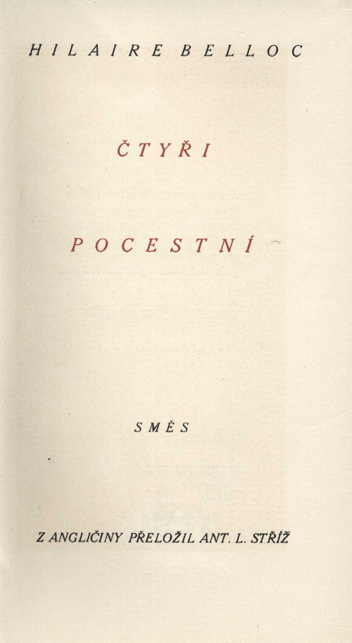 1. Názvové údajeČtyři pocestní : směs / Hilaire Belloc ; z angličtiny přeložil Ant. L. Stříž ; [vypravil a dřevoryty vyryl Jaroslav Benda]