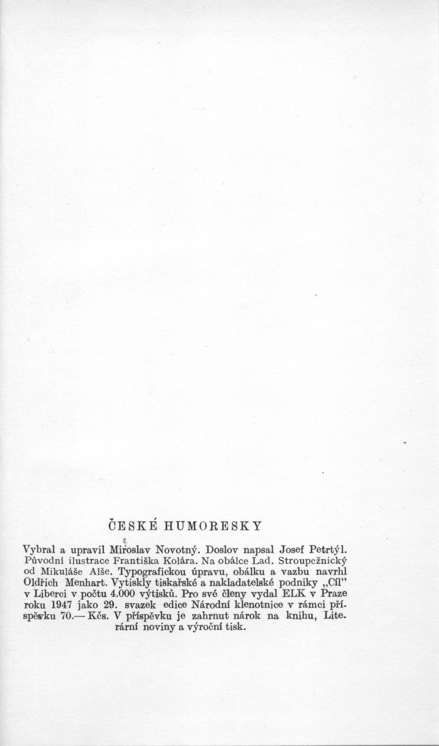 1. Názvové údajeČeské humoresky : ze starých sbírek / vybral [a upravil] Miroslav Novotný ; [doslov napsal Josef Petrtýl [sic!] ; původní ilustrace Františka Kolára ; na obálce Ladislav Stroupežnický od Mikuláše Alše ; typografickou úpravu, obálku a vazbu navrhl Oldřich Menhart]