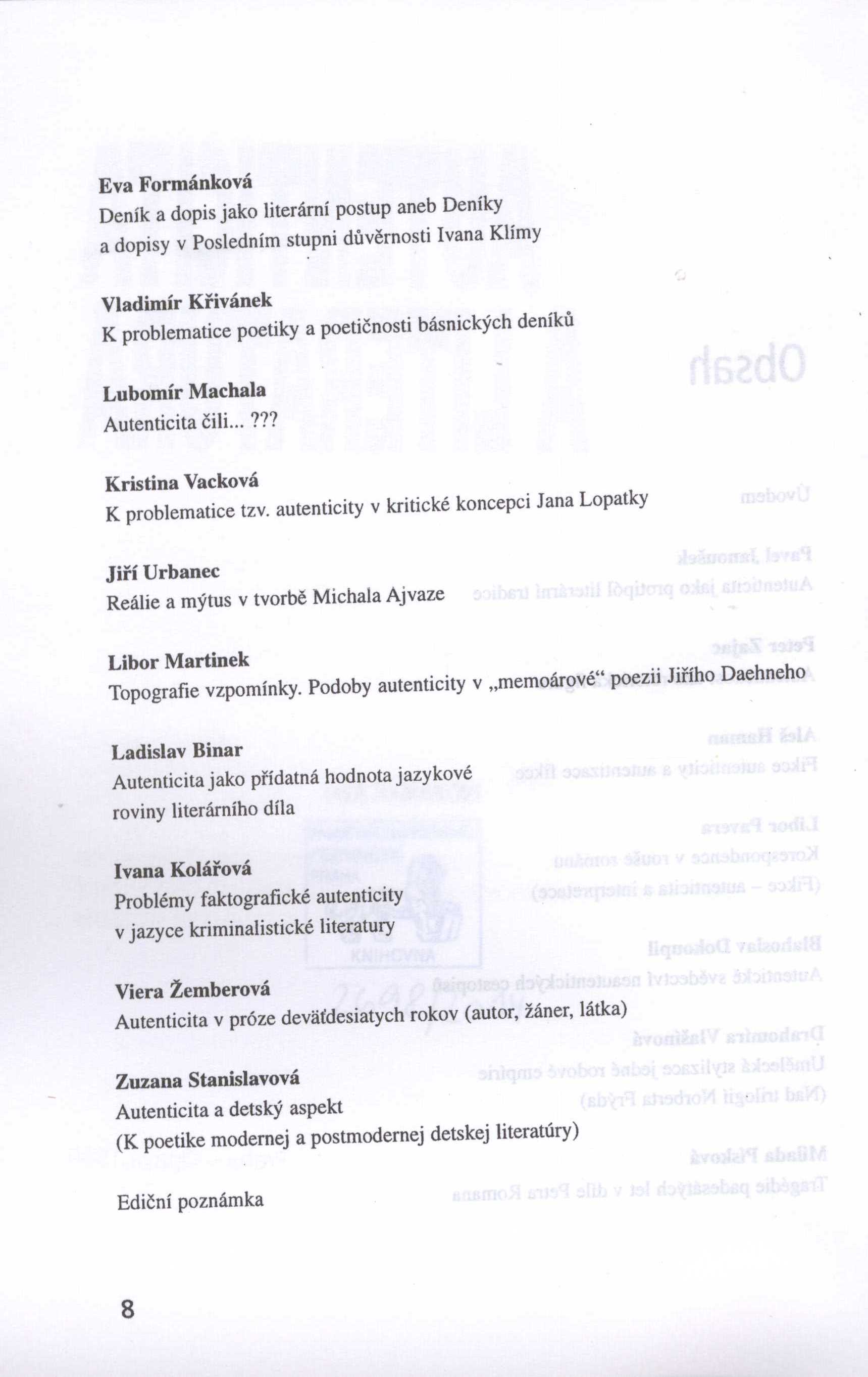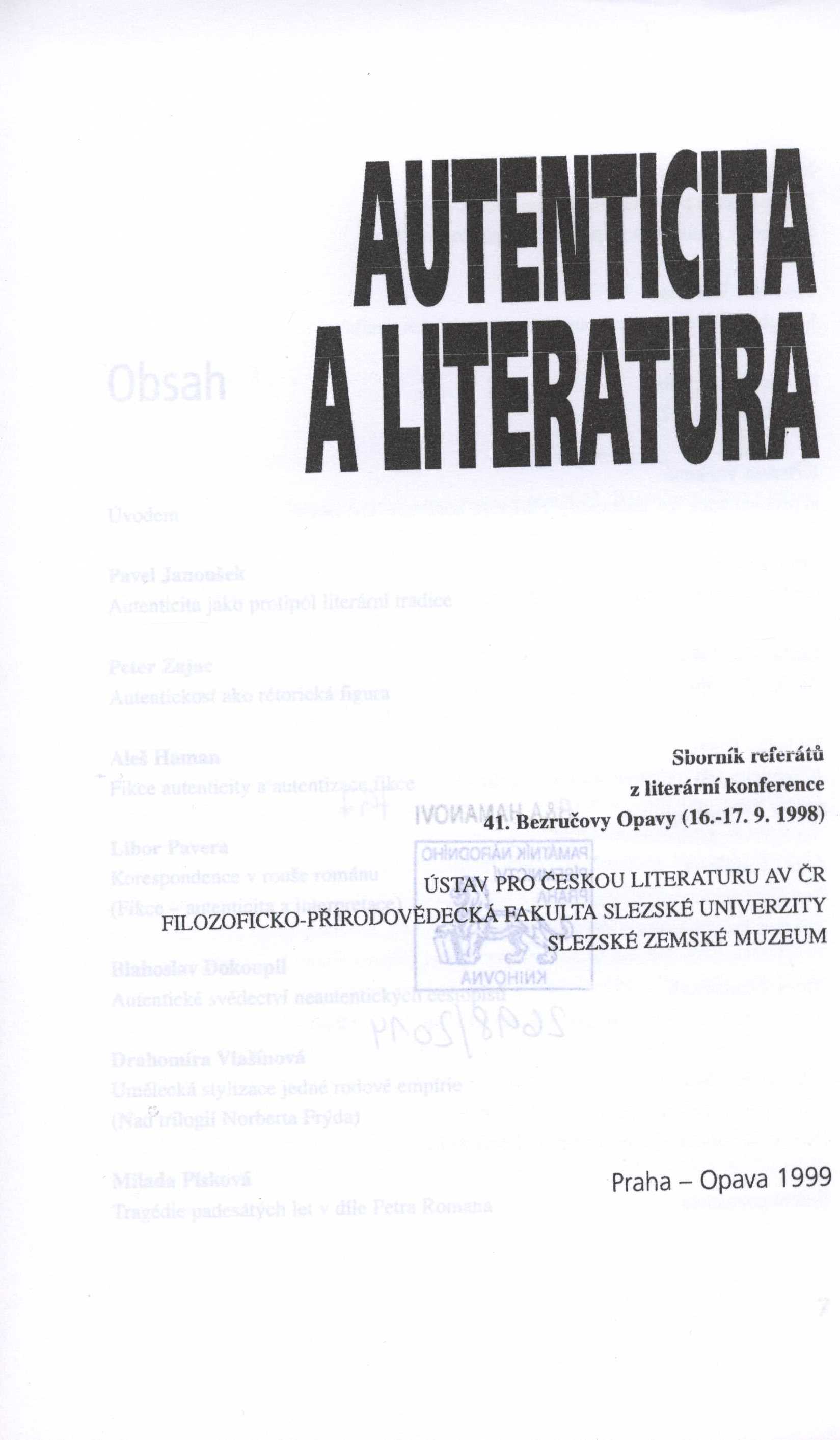 1. Názvové údajeAutenticita a literatura : sborník referátů z literární konference 41. Bezručovy Opavy 16.-17. 9. 1998 / [redigoval Vladimír Křivánek]