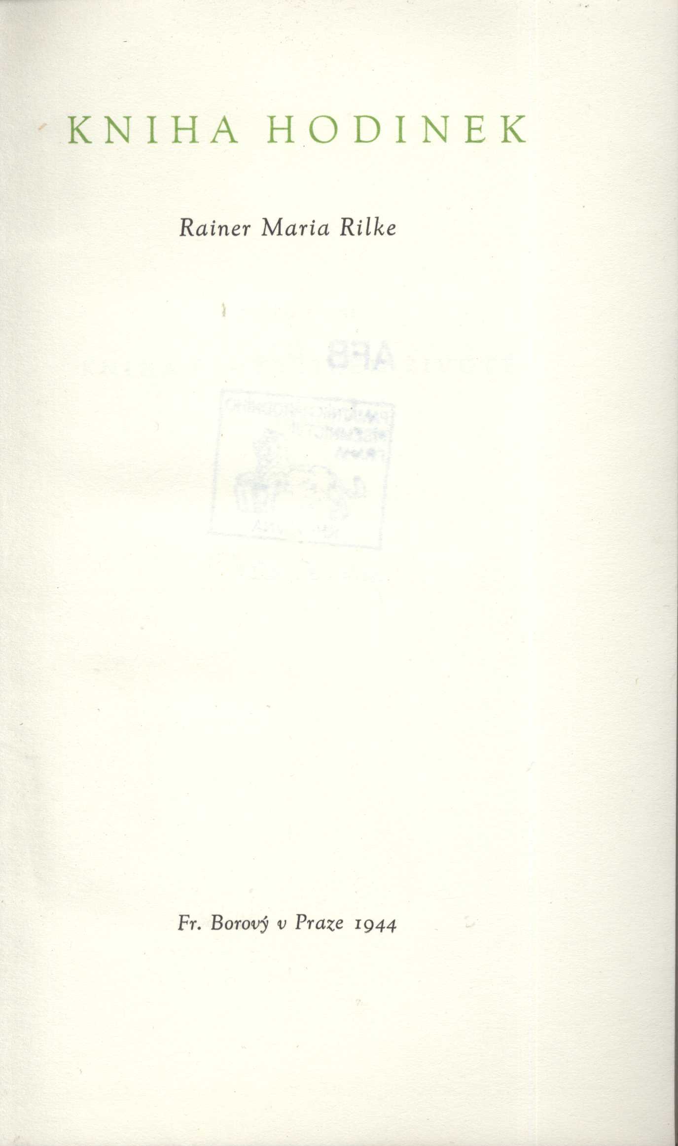 1. Názvové údajeKniha hodinek / Rainer Maria Rilke ; [z německého originálu ... přeložil Jozef Tkadlec ; doslovem opatřil Jaroslav Janů ; obálku navrhl a graficky upravil F. Muzika]