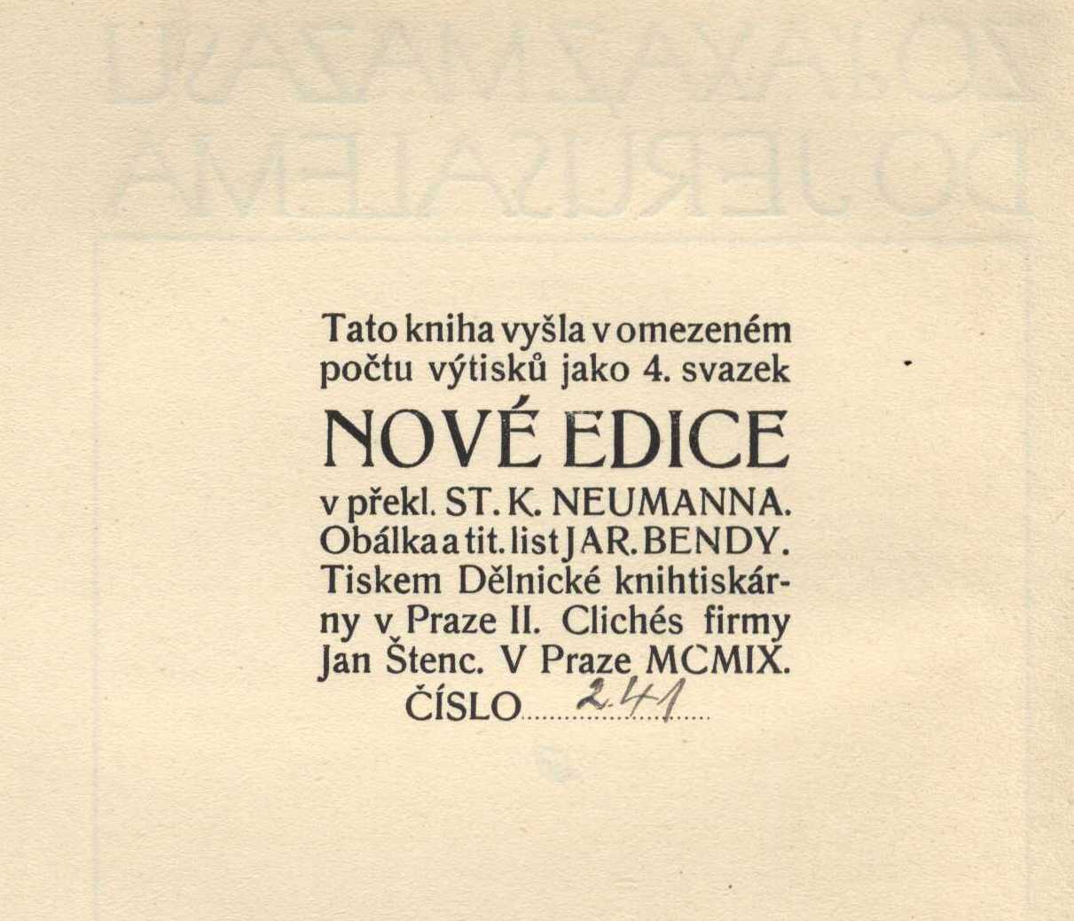 1. Názvové údajeZ Mazasu do Jerusalema / Zo d'Axa ; [v překladu St. K. Neumanna ; obálka a tit. list Jar. Bendy]