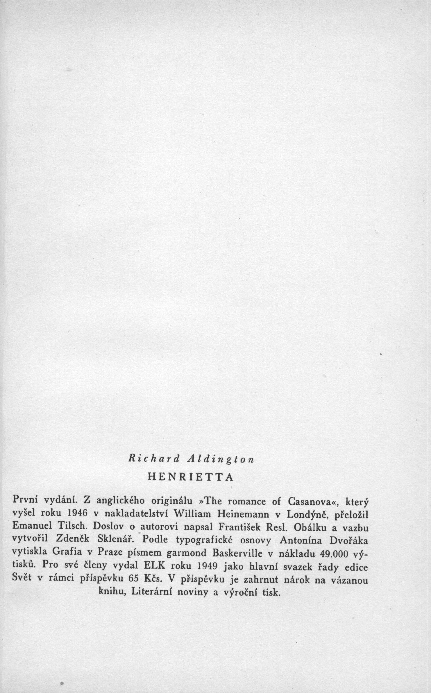 Názvové údajeHenrietta / Richard Aldington ; [z anglického originálu ... přeložil Emanuel Tilsch ; doslov o autorovi napsal František Resl ; obálku a vazbu vytvořil Zdeněk Sklenář ; podle typografické osnovy Antonína Dvořáka ...]