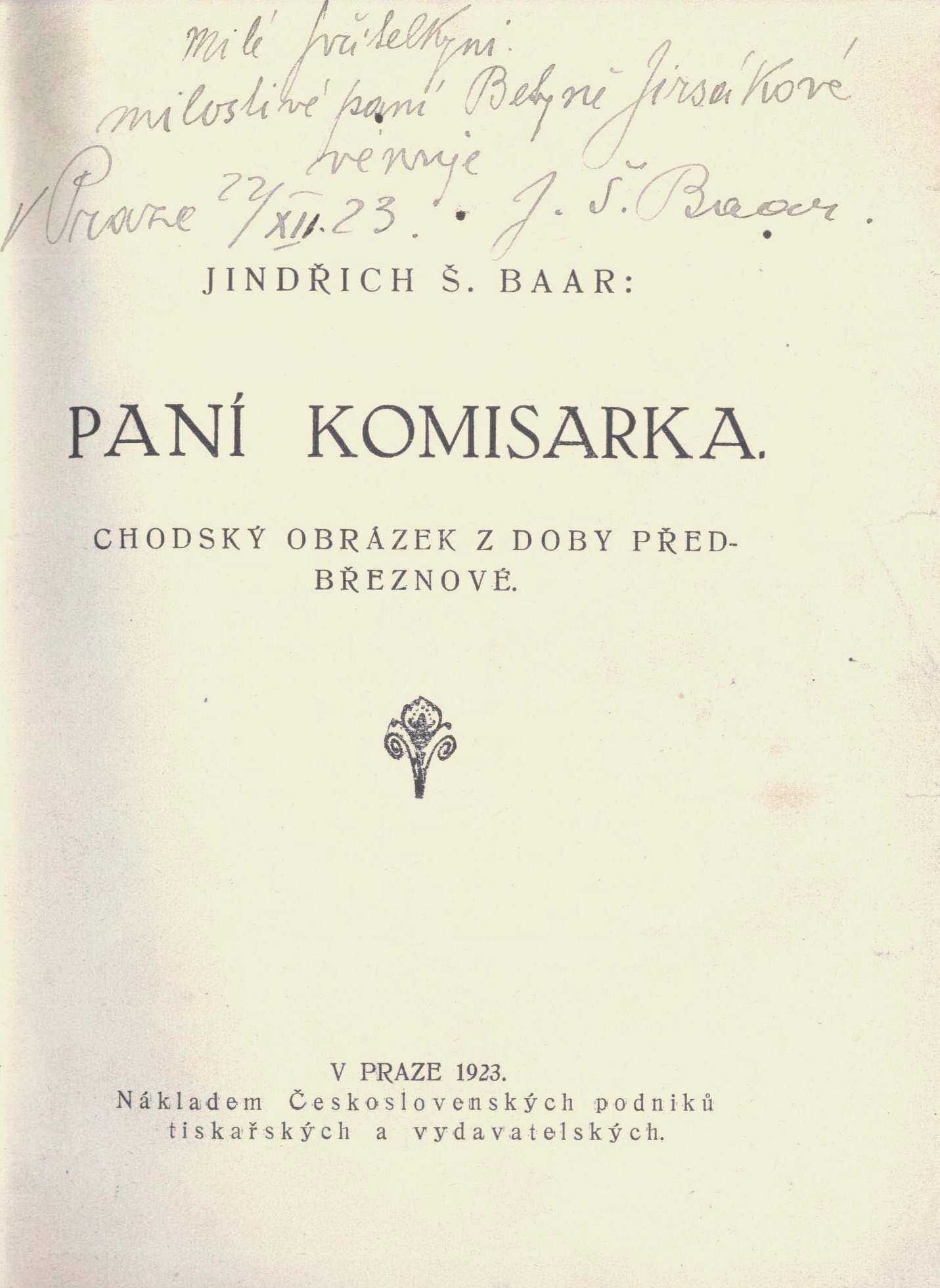 1. Názvové údajePaní komisarka : chodský obrázek z doby předbřeznové / Jindřich Š. Baar