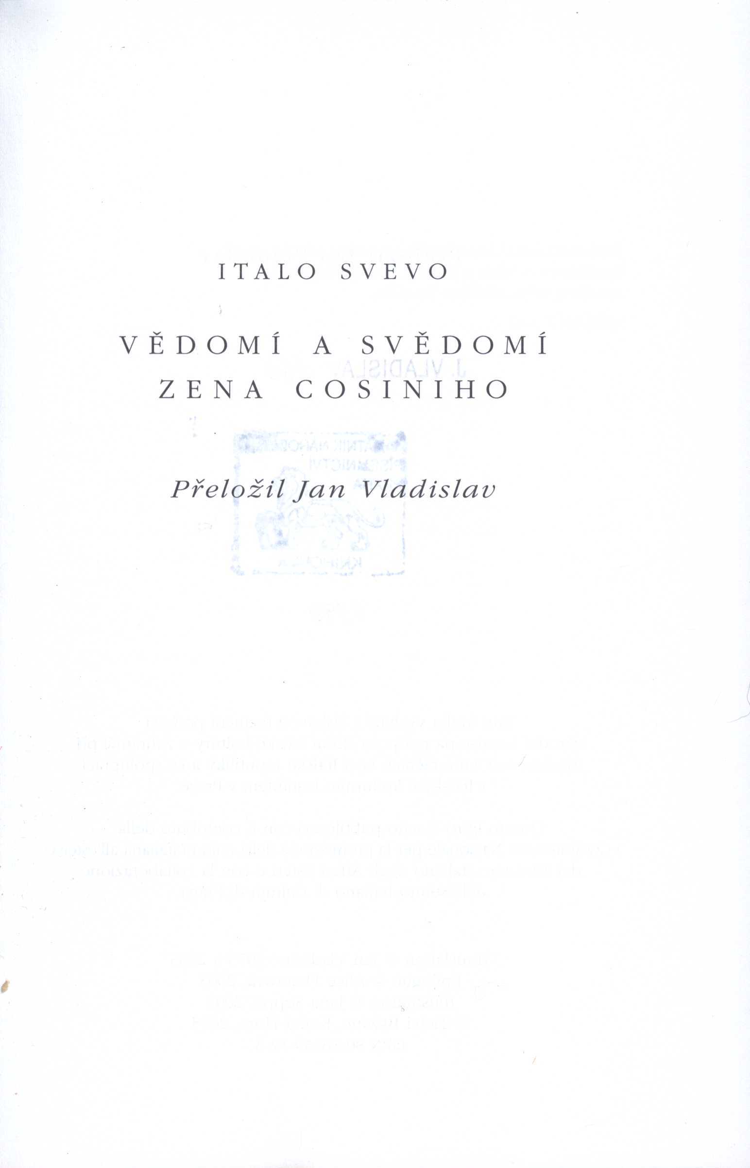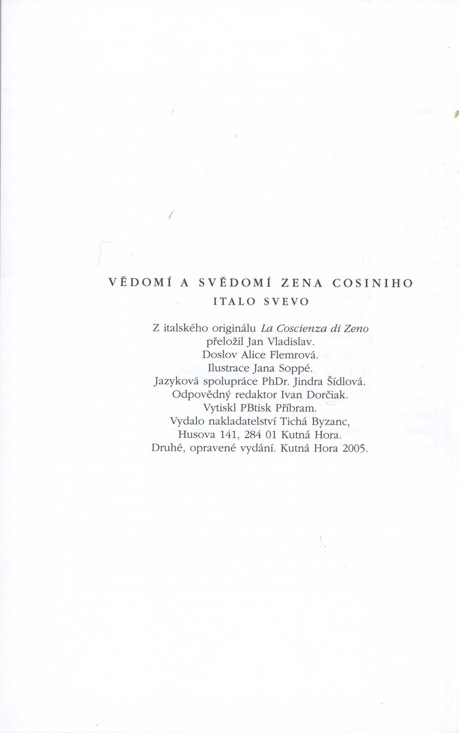 1. Názvové údajeVědomí a svědomí Zena Cosiniho / Italo Svevo ; [z italského originálu ... přeložil Jan Vladislav ; doslov Alice Flemrová ; ilustrace Jana Soppé]