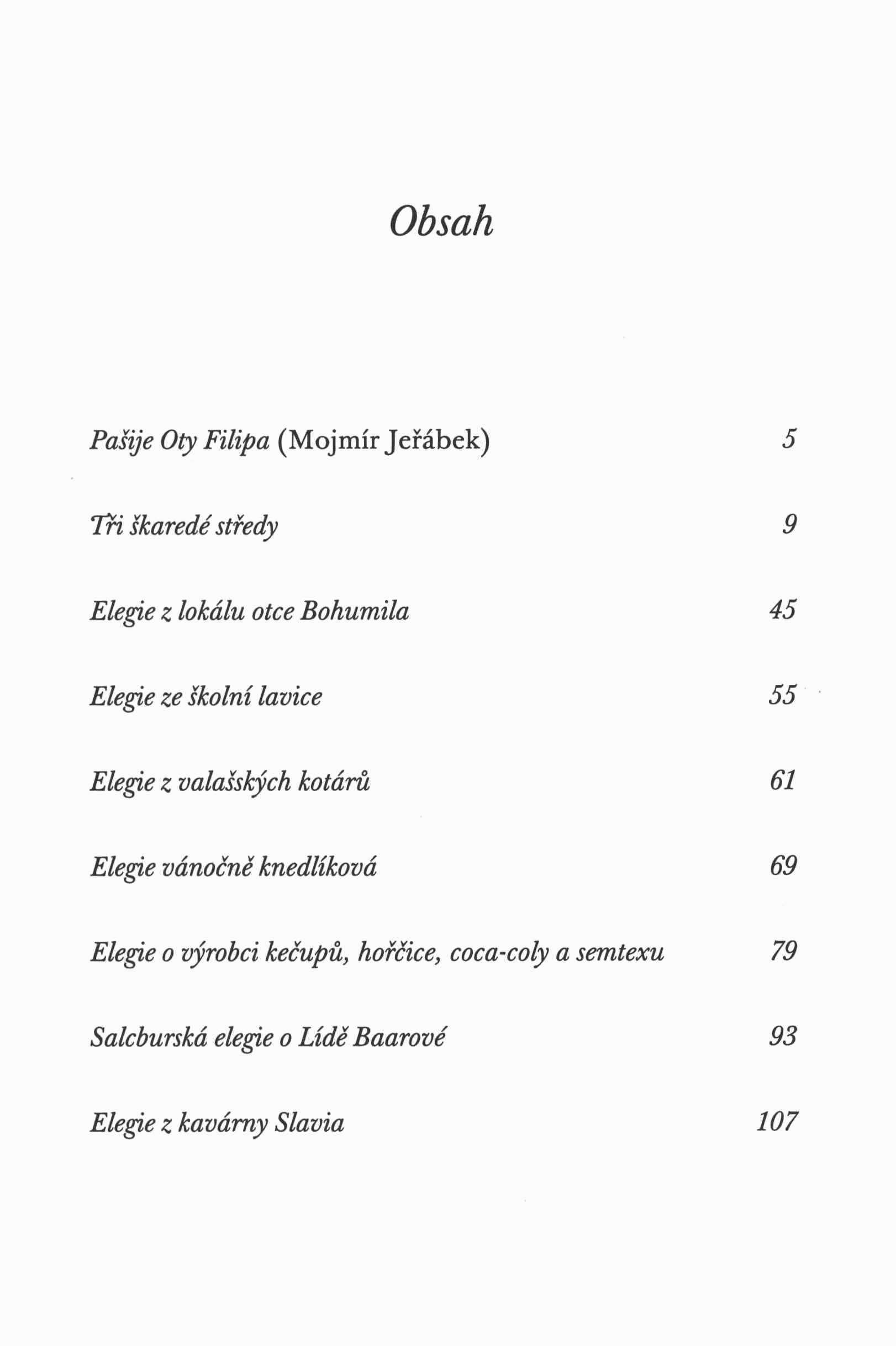 1. Názvové údajeTři škaredé středy a sedm dalších elegií o zlých dnech / Ota Filip ; [obálka Bohdan Bobo Lukáš ; předmluva Mojmír Jeřábek]