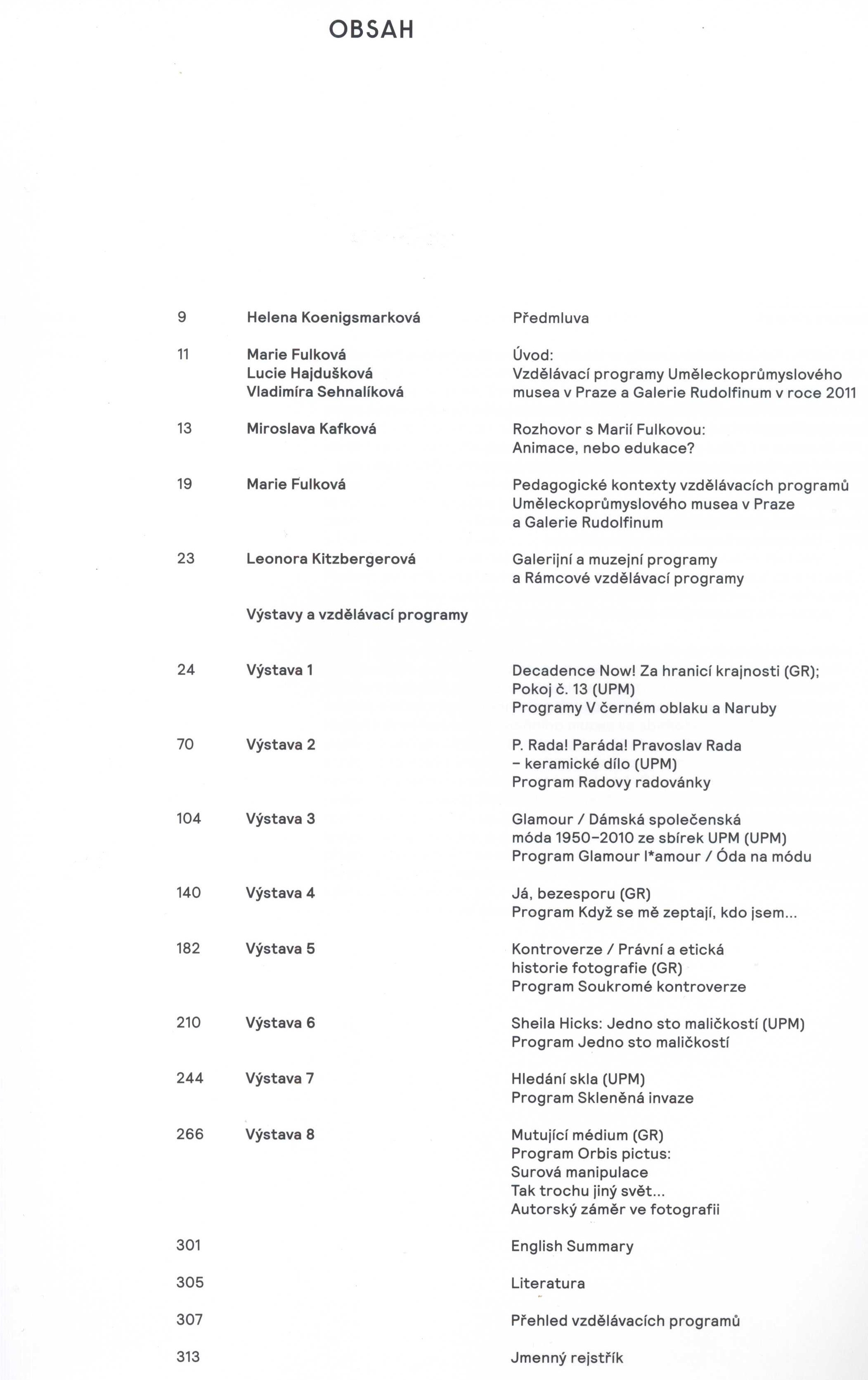 1. Názvové údajeGalerijní a muzejní edukace 1 : vlastní cestou k umění : vzdělávací programy Uměleckoprůmyslového musea v Praze a Galerie Rudolfinum v roce 2011 / [koncepce, texty]: Fulková, Hajdušková, Sehnalíková ; grafický design: Štěpán Malovec