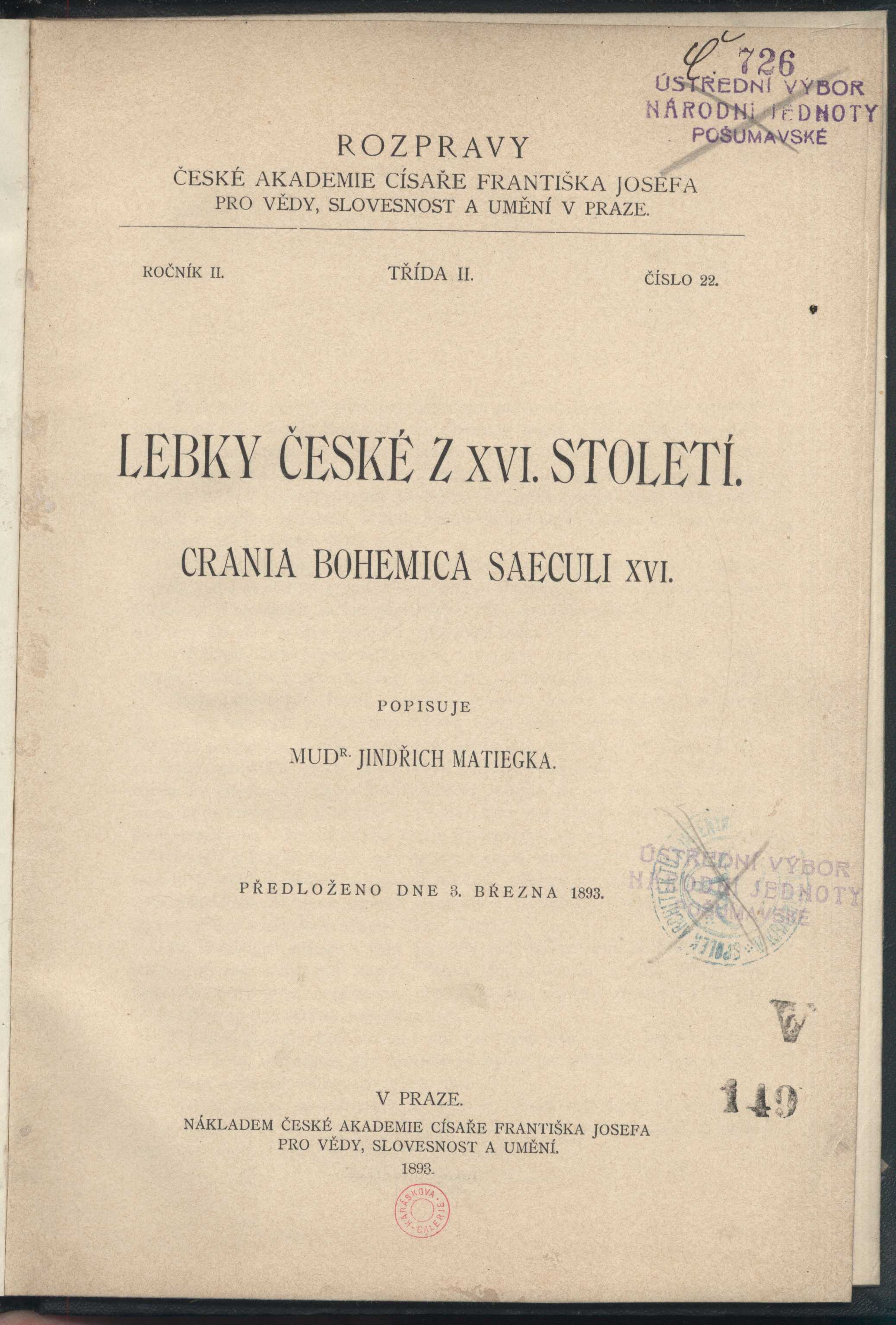 1. Názvové údajeLebky české z XVI. století = Crania bohemica saeculi XVI : předloženo dne 3. března 1893 / popisuje Jindřich Matiegka