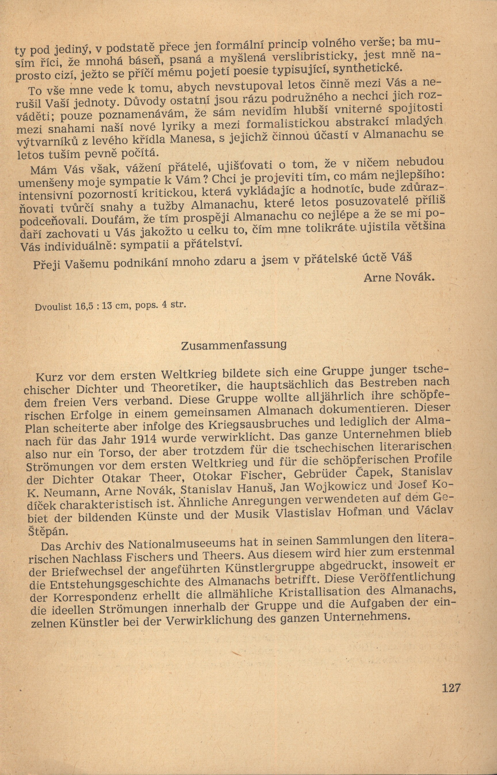Klíčová slova česká literatura * stati * články * vznik * almanachy * r. 1914 * korespondence * Theer O. * Fischer O. * Čapek K. * Novák A. * separáty