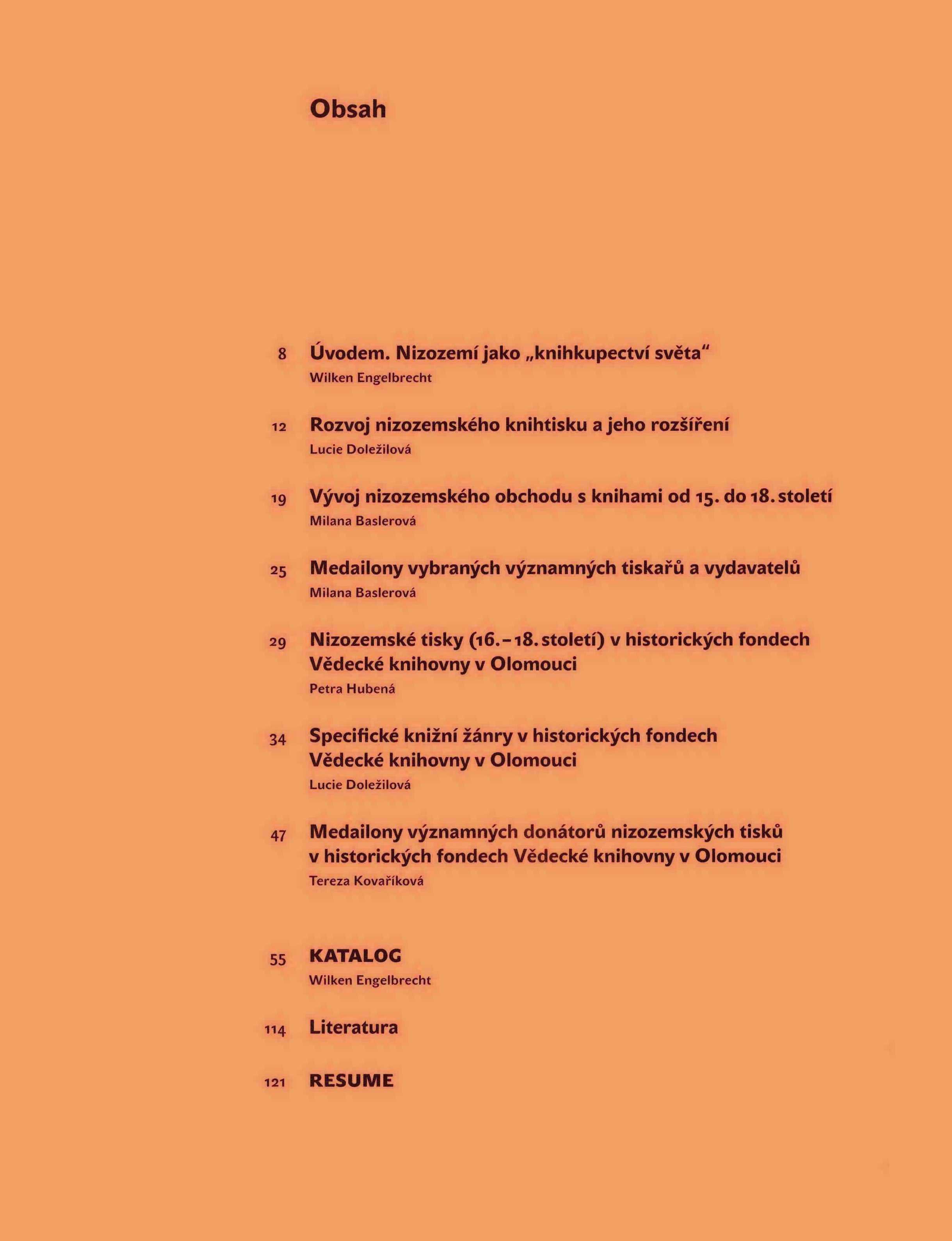 4. Názvové údajeBarokní knihkupectví světa : nizozemské tisky 16.-18. století ze sbírek Vědecké knihovny v Olomouci / Wilken Engelbrecht, Gabriela Elbelová eds.; texty Milena Baslerová, Lucie Doležilová, Wilken Engelbrecht, Petra Hubená, Tereza Kovaříková; překlad Wilken Engelbrecht; obálka a grafická úprava Petr Šmalec