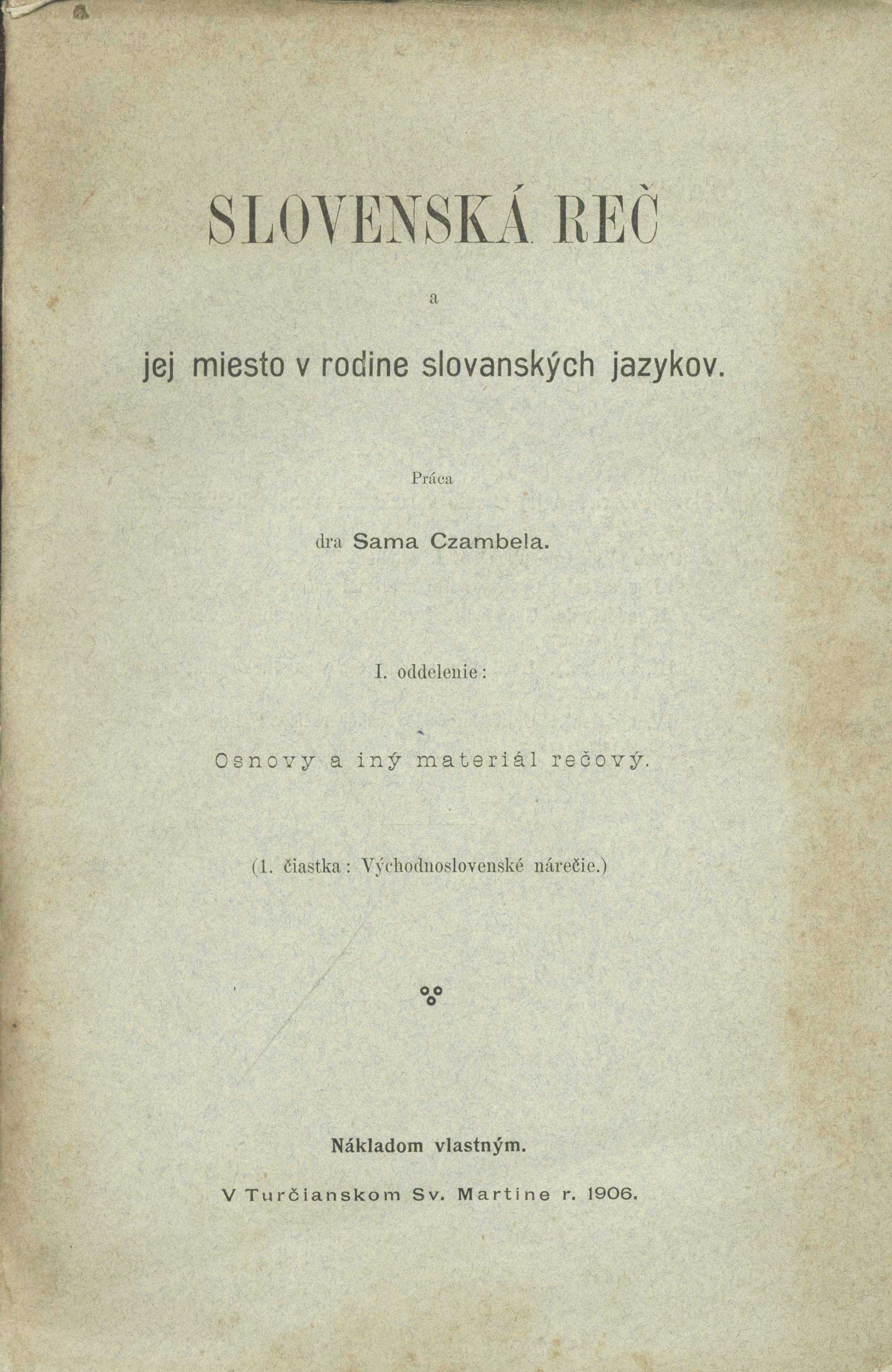 1. Názvové údajeSlovenská reč a jej miesto v rodine slovanských jazykov. I. oddelenie, Osnovy a iný materiál rečový. 1. čiastka, Východnoslovenské nárečie / práca dra Sama Czambela
