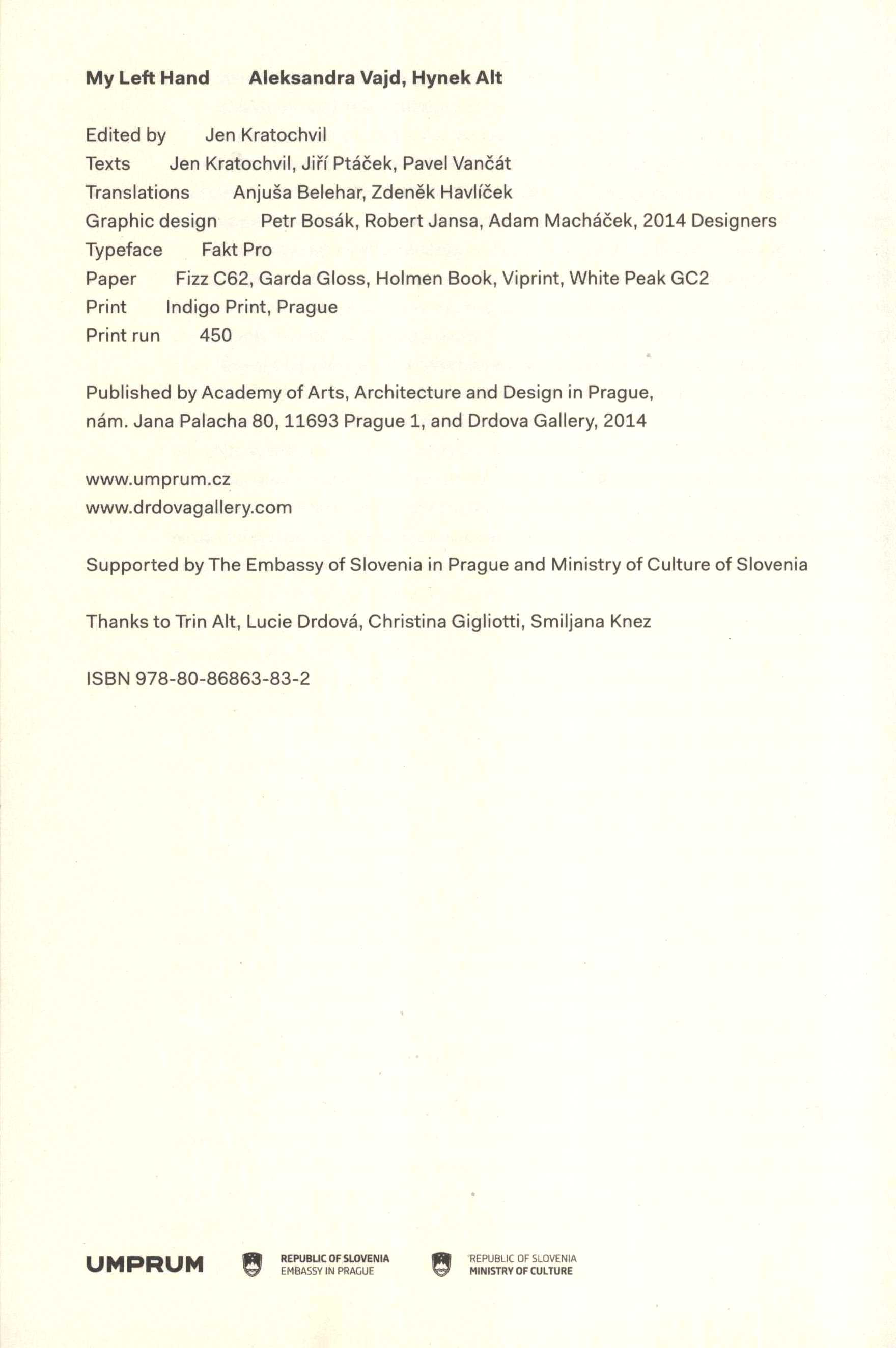 | Názvové údaje | Alt, Vajd: My left hand / edited by Jen Kratochvil ; texts Jen Kratochvil, Jiří Ptáček, Pavel Vančát ; translations Anjuša Belehar, Zdeněk Havlíček ; graphic design Petr Bosák, Robert Jansa, Adam Macháček, 2014 Designers