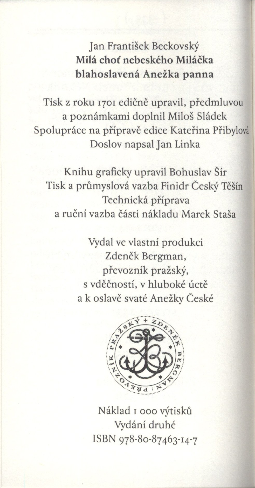1. Názvové údajeMilá choť nebeského Miláčka blahoslavená Anežka panna / Jan František Beckovský ; ed. Miloš Sládek