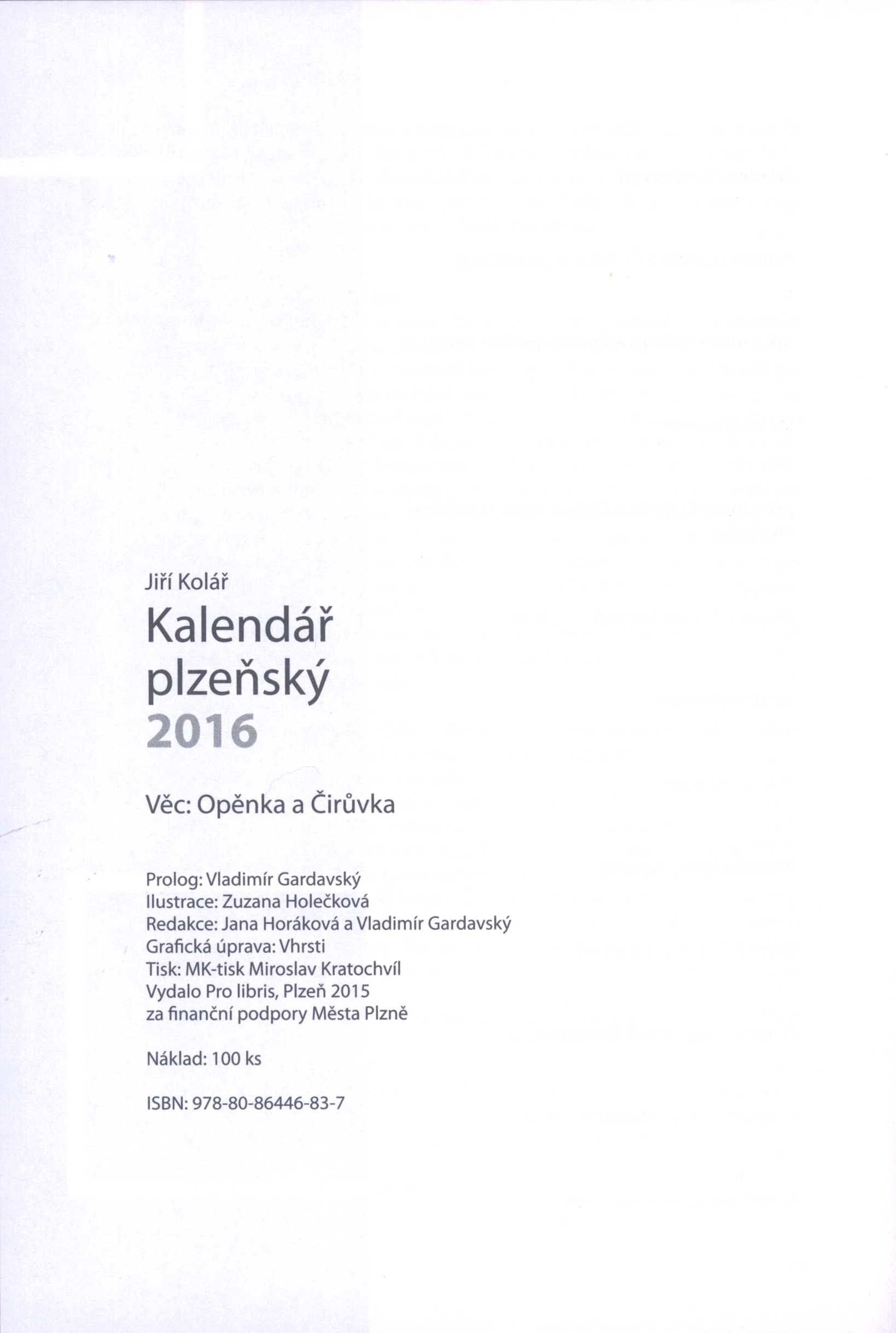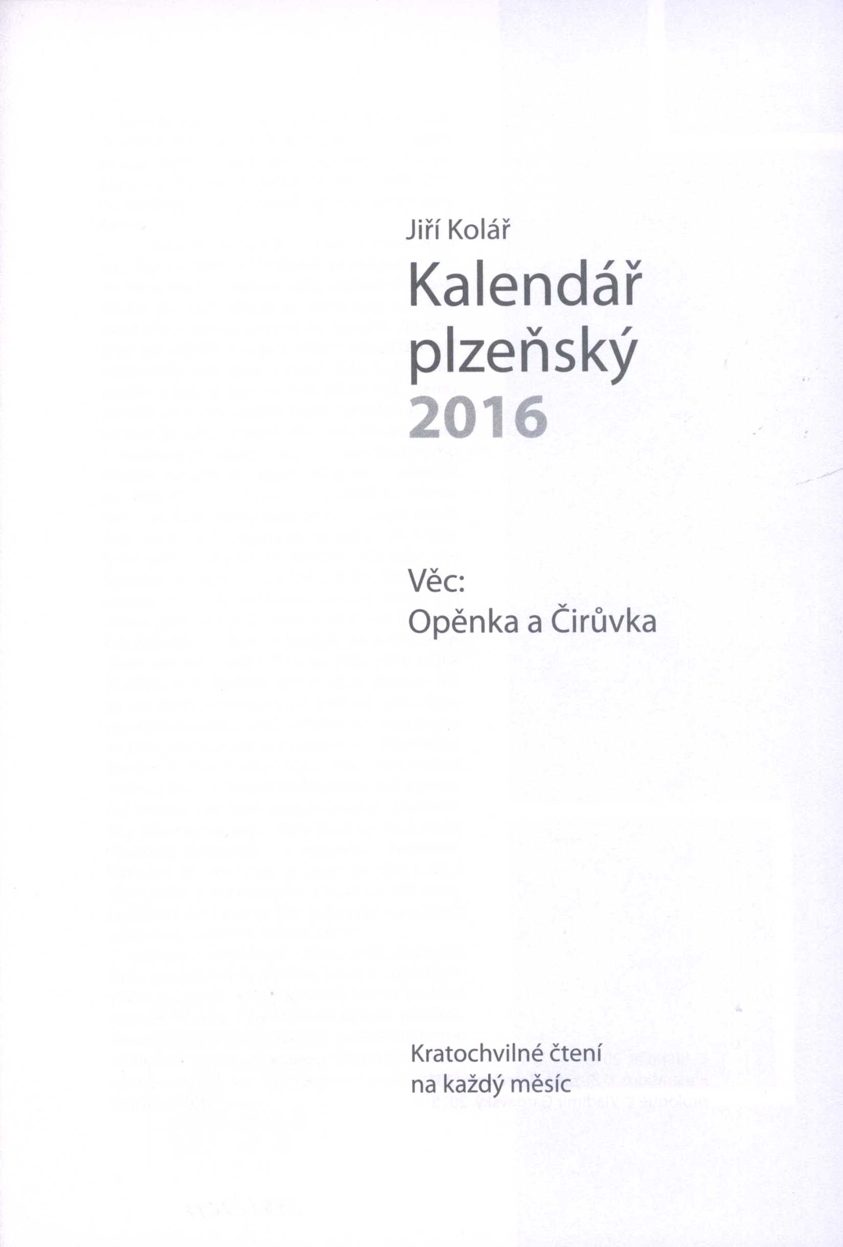 1. Názvové údajeKalendář plzeňský 2016 : kratochvilné čtení na každý měsíc. Věc: Opěnka a Čirůvka / Jiří Kolář
