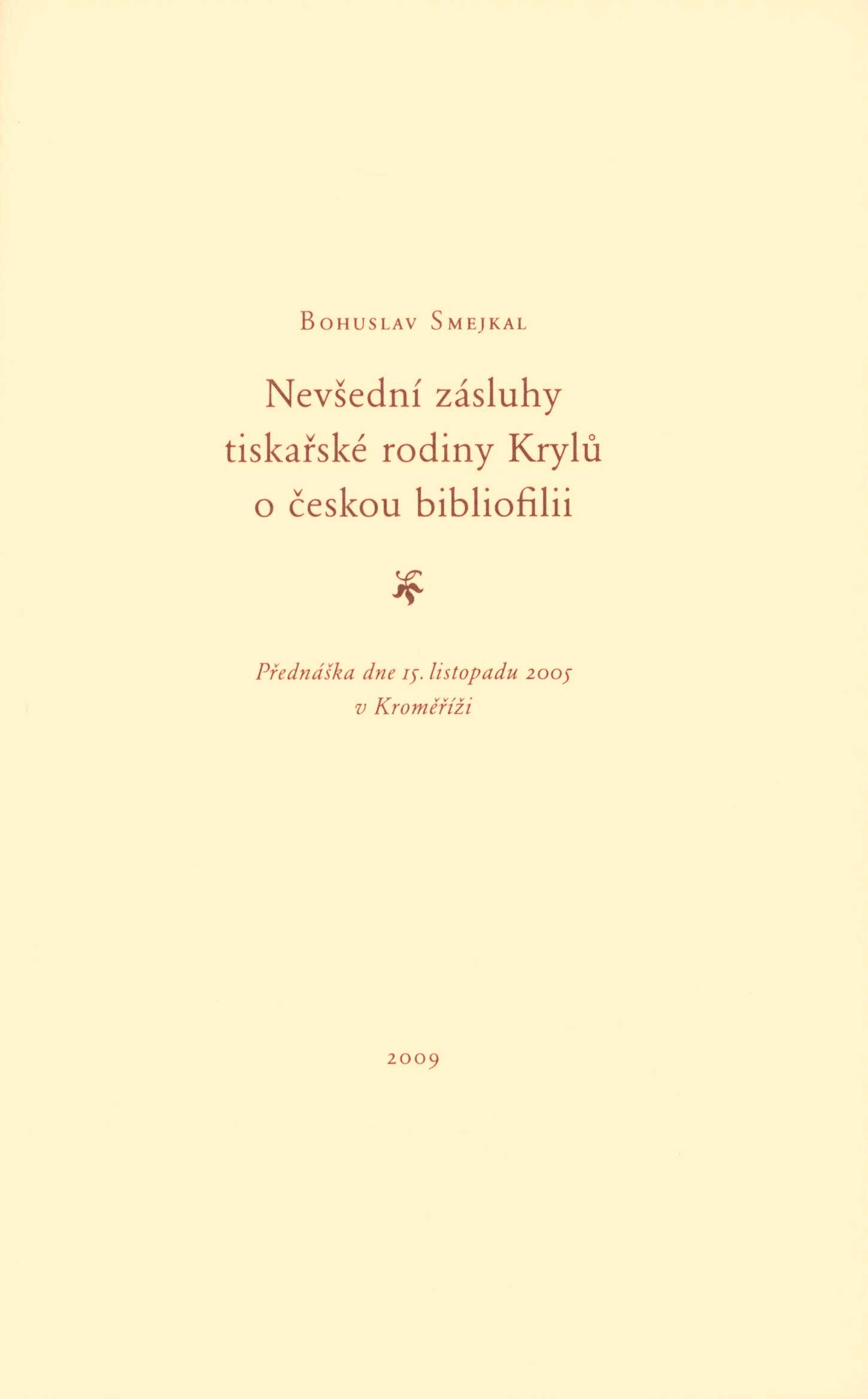 2. Názvové údajeNevšední zásluhy tiskařské rodiny Krylů o českou bibliofilii : přednáška dne 15. listopadu 2005 v Kroměříži / Bohuslav Smejkal ; [přiložen graficky list Lucie Raškovové ; graficky upravil Otakar Karlas]