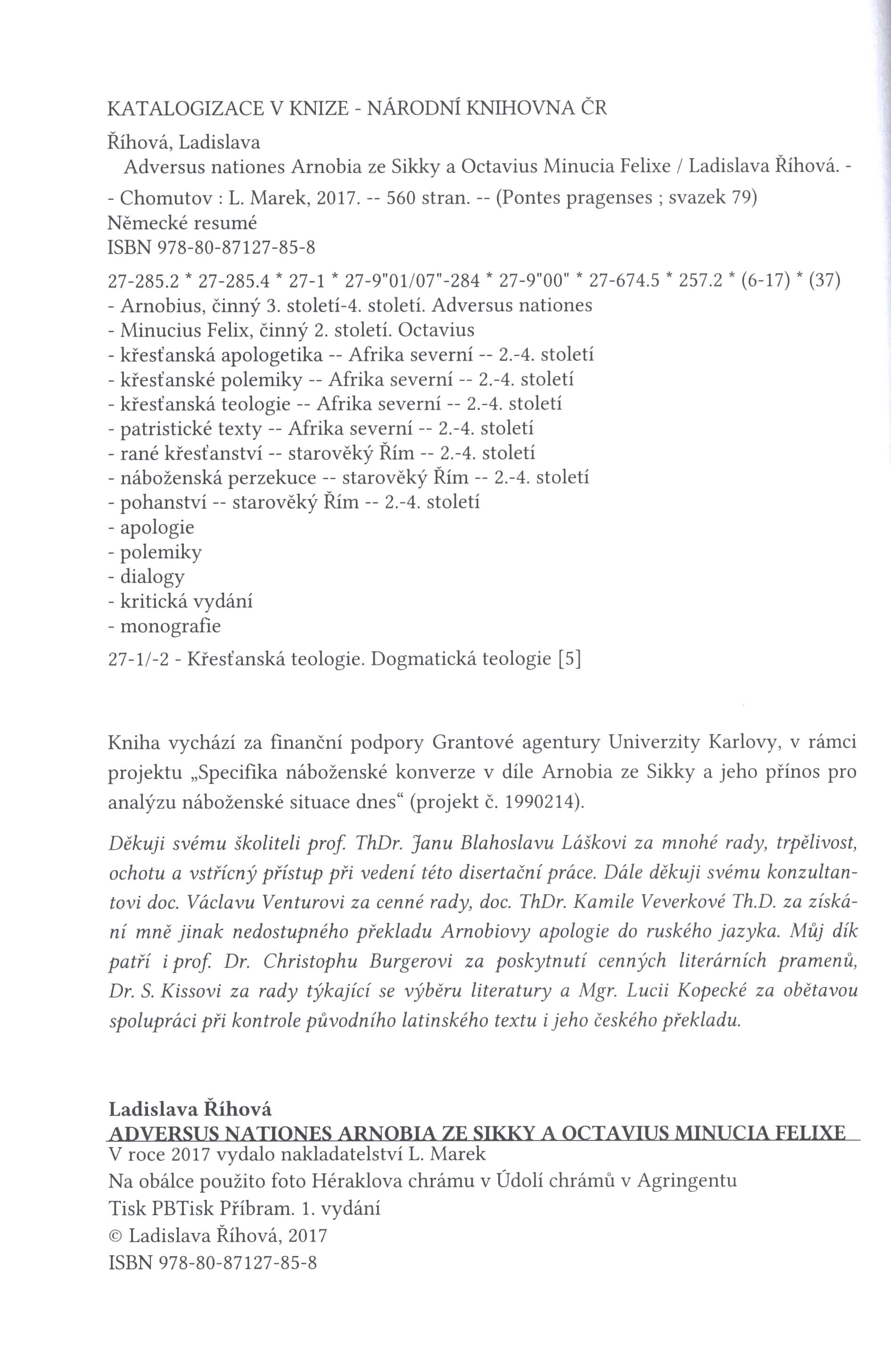 1. Názvové údajeAdversus nationes Arnobia ze Sikky a Octavius Minucia Felixe / Ladislava Říhová