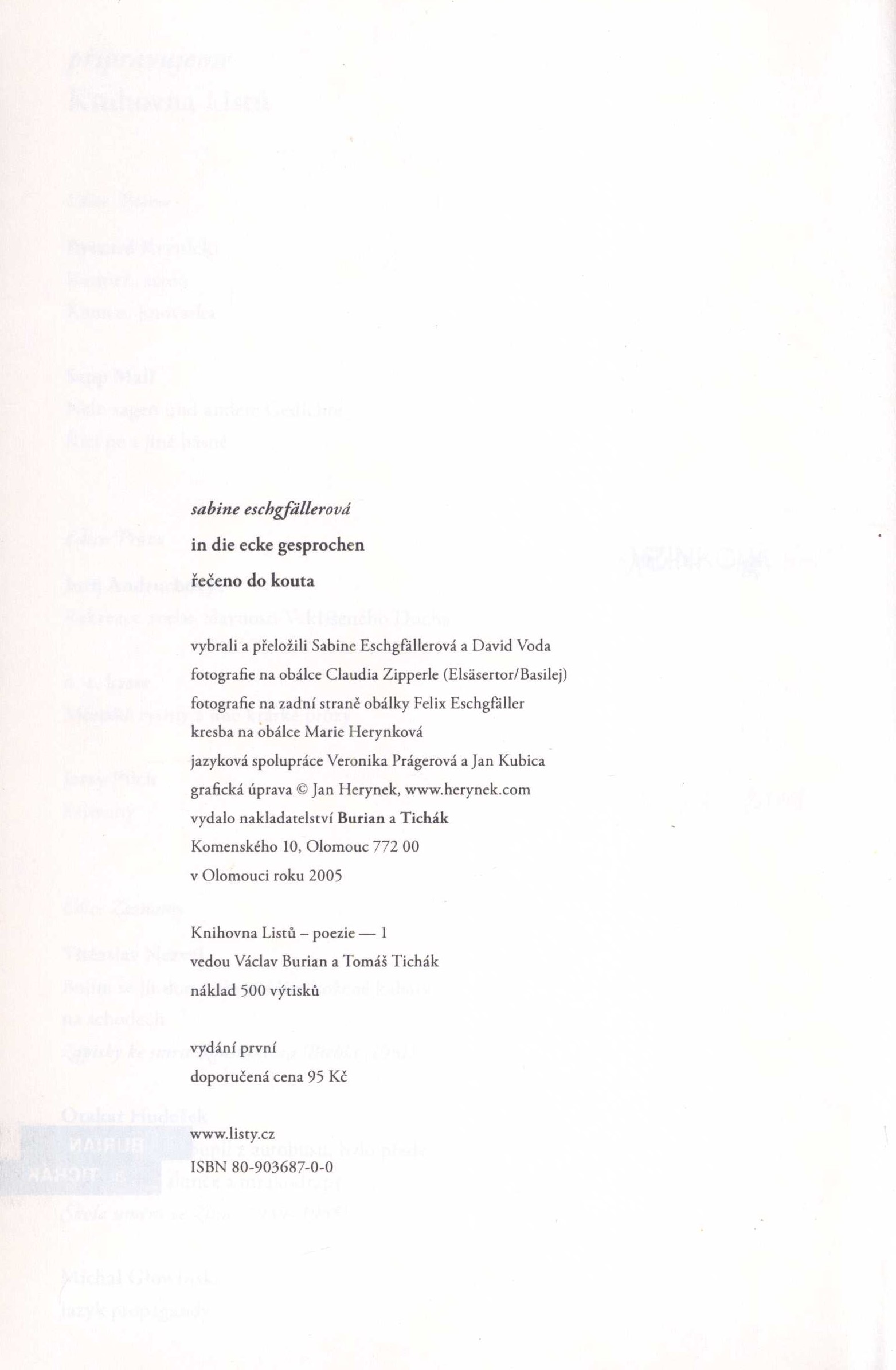 1. Názvové údajeIn die Ecke gesprochen = Řečeno do kouta / Sabine Eschgfällerová