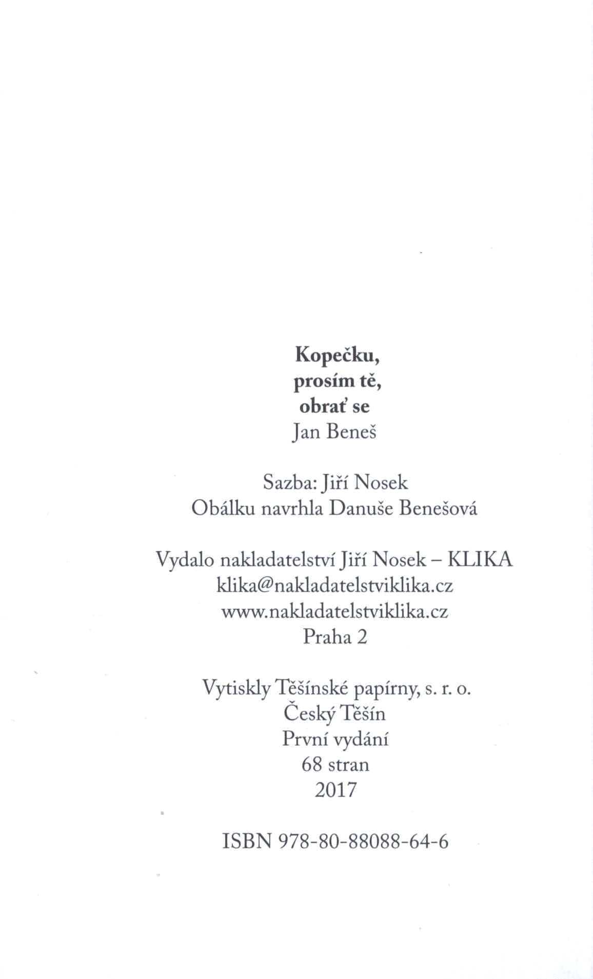 3. Názvové údajeKopečku, prosím tě, obrať se / Jan Beneš ; obálku navrhla Danuše Benešová