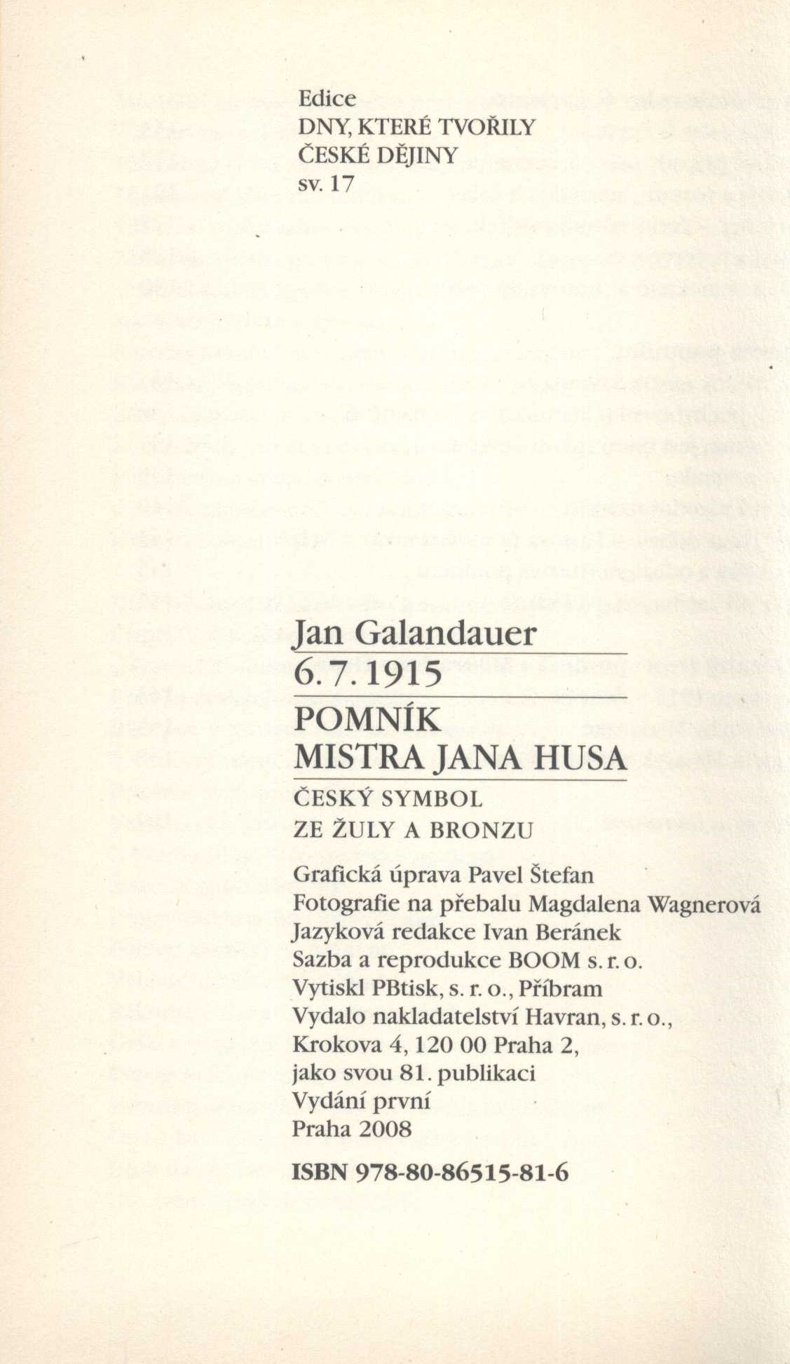 1. Názvové údaje6. 7. 1915 - pomník Mistra Jana Husa : český symbol ze žuly a bronzu / Jan Galandauer