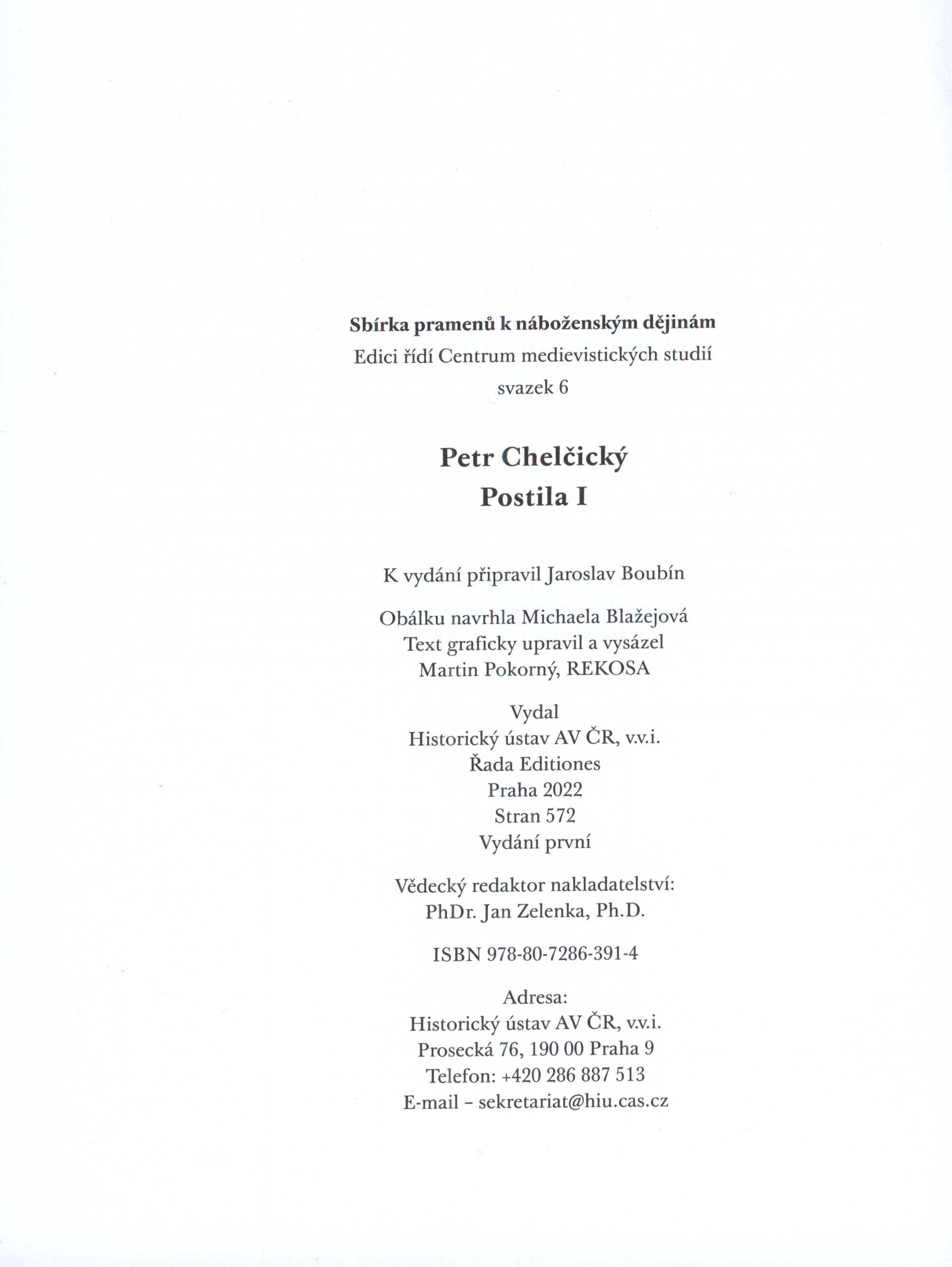 Názvové údajePostila. I / Petr Chelčický ; k vydání připravil Jaroslav Boubín ; obálku navrhla Michaela Blažejová ; text graficky upravil a vysázel Martin Pokorný, REKOSA