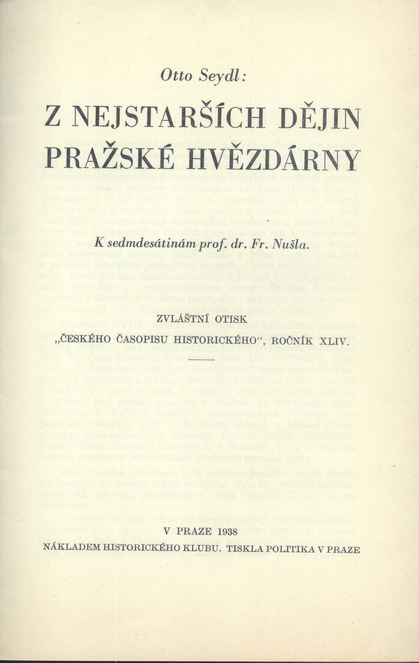 1. Názvové údajeZ nejstarších dějin Pražské hvězdárny : k sedmdesátinám prof. dr. Fr. Nušla / Otto Seydl