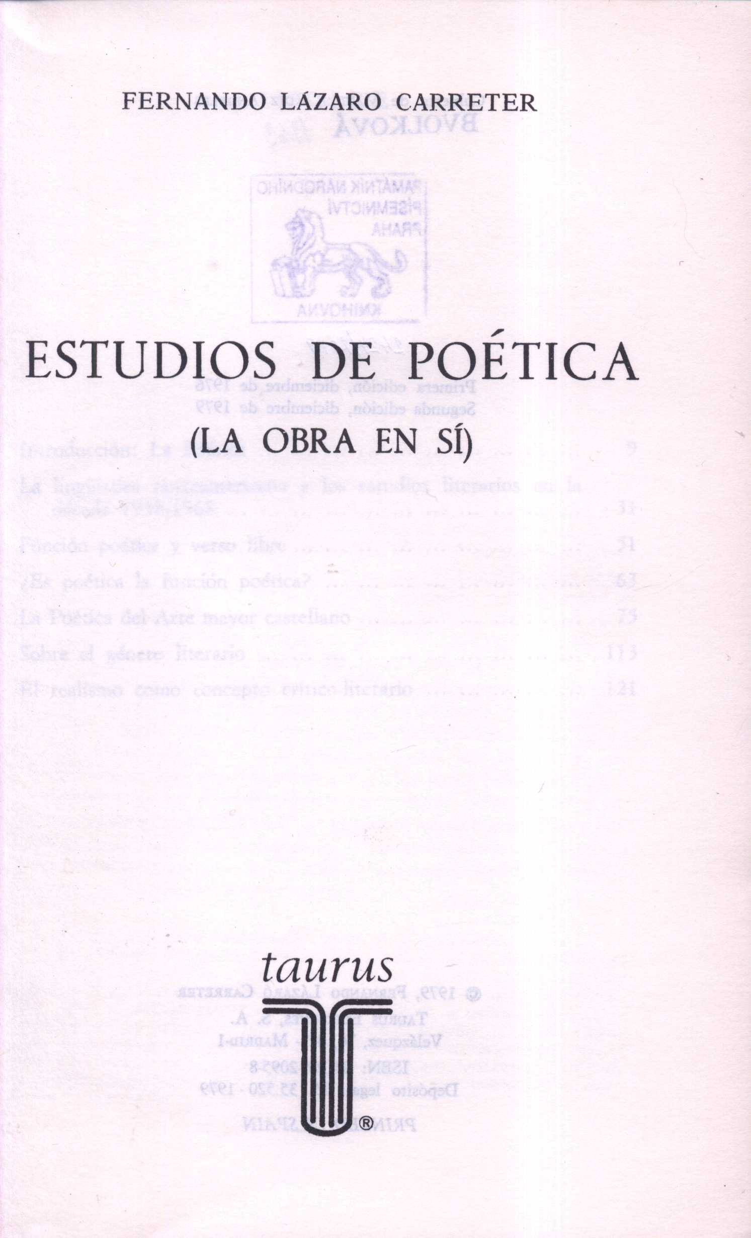 1. Názvové údajeEstudios de Poética : (la obra en sí) / Fernando Lázaro Carreter