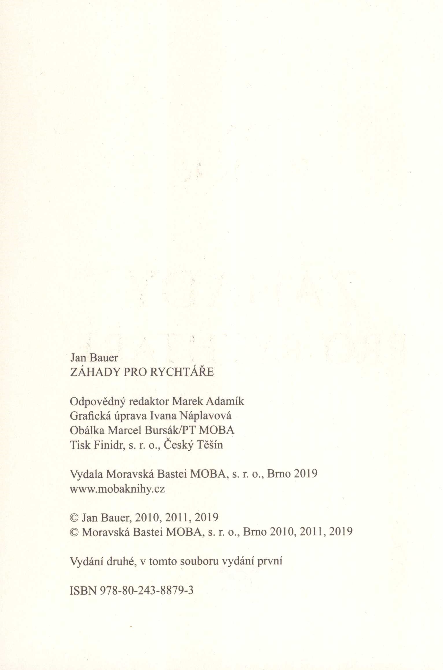 1. Názvové údajeZáhady pro rychtáře / Jan Bauer ; grafická úprava Ivana Náplavová ; obálka Marcel Bursák/PT MOBA