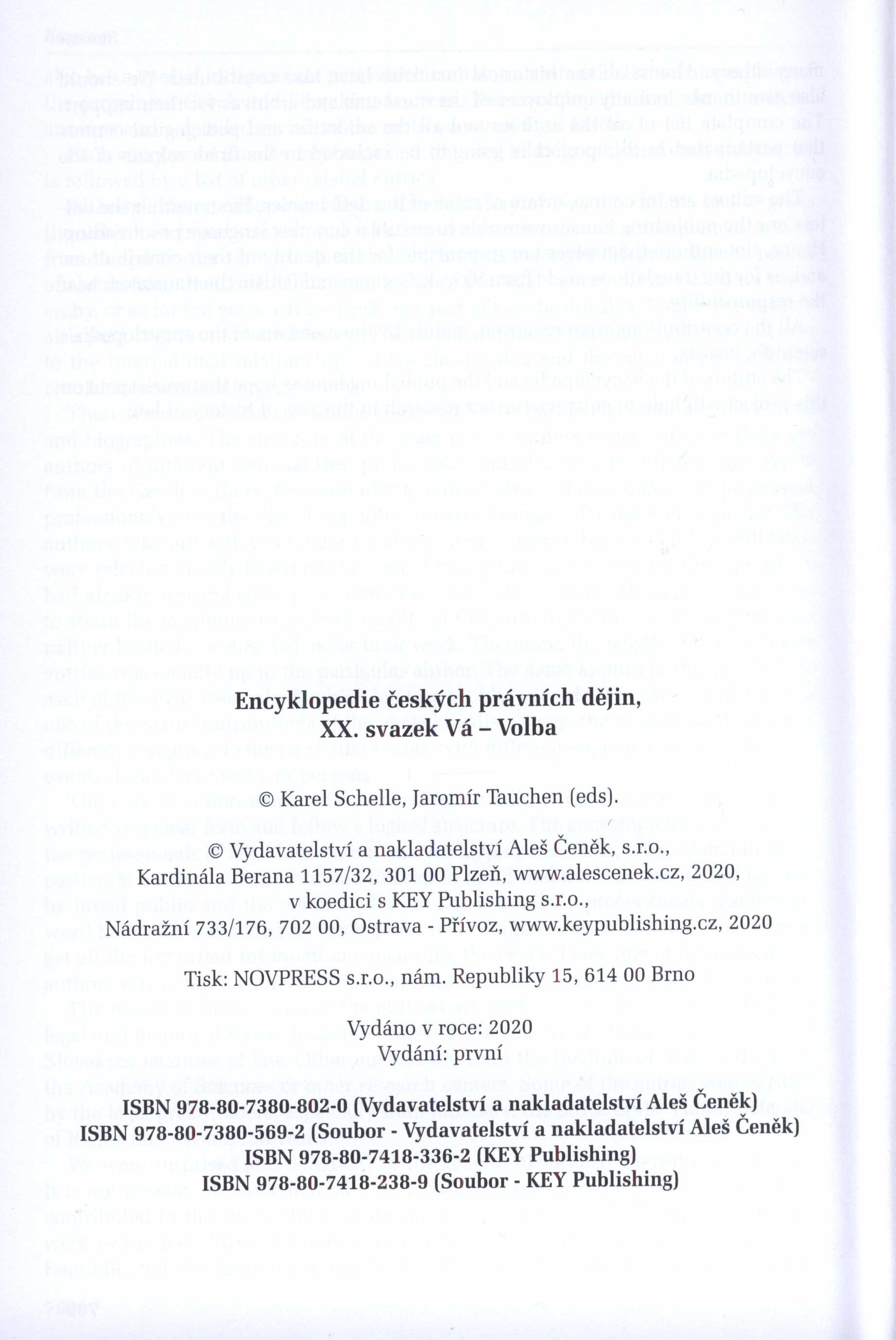 1. Názvové údajeEncyklopedie českých právních dějin. XX. svazek, Vá-Volba / Karel Schelle, Jaromír Tauchen (eds).