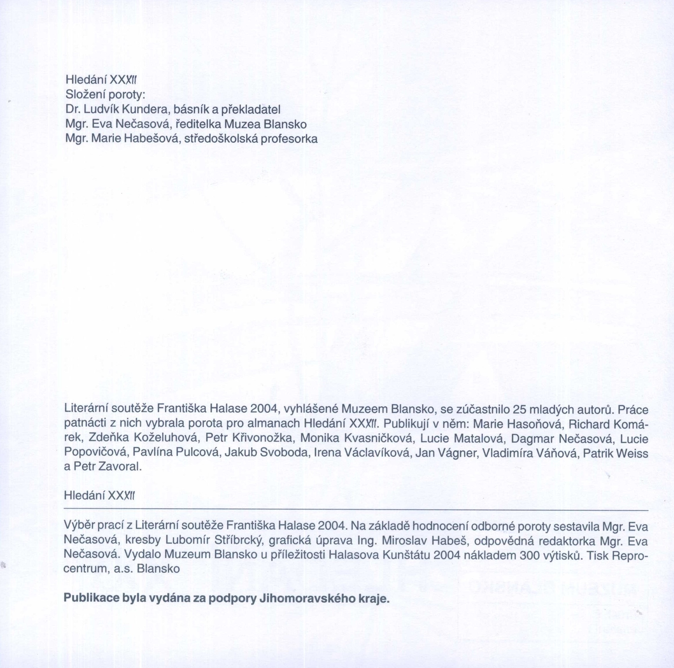 Názvové údajeHledání : výběr prací z Literární soutěže Františka Halase 2004 / na základě hodnocení odborné poroty sestavila Eva Nečasová ; kresby Lubomír Stříbrcký ; grafická úprava Miroslav Habeš