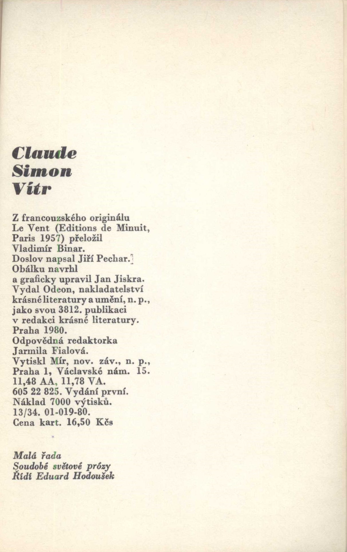 Klíčová slova francouzská literatura * román * francouzský román * Simon C. * český překlad * Binar V. * r. 1980