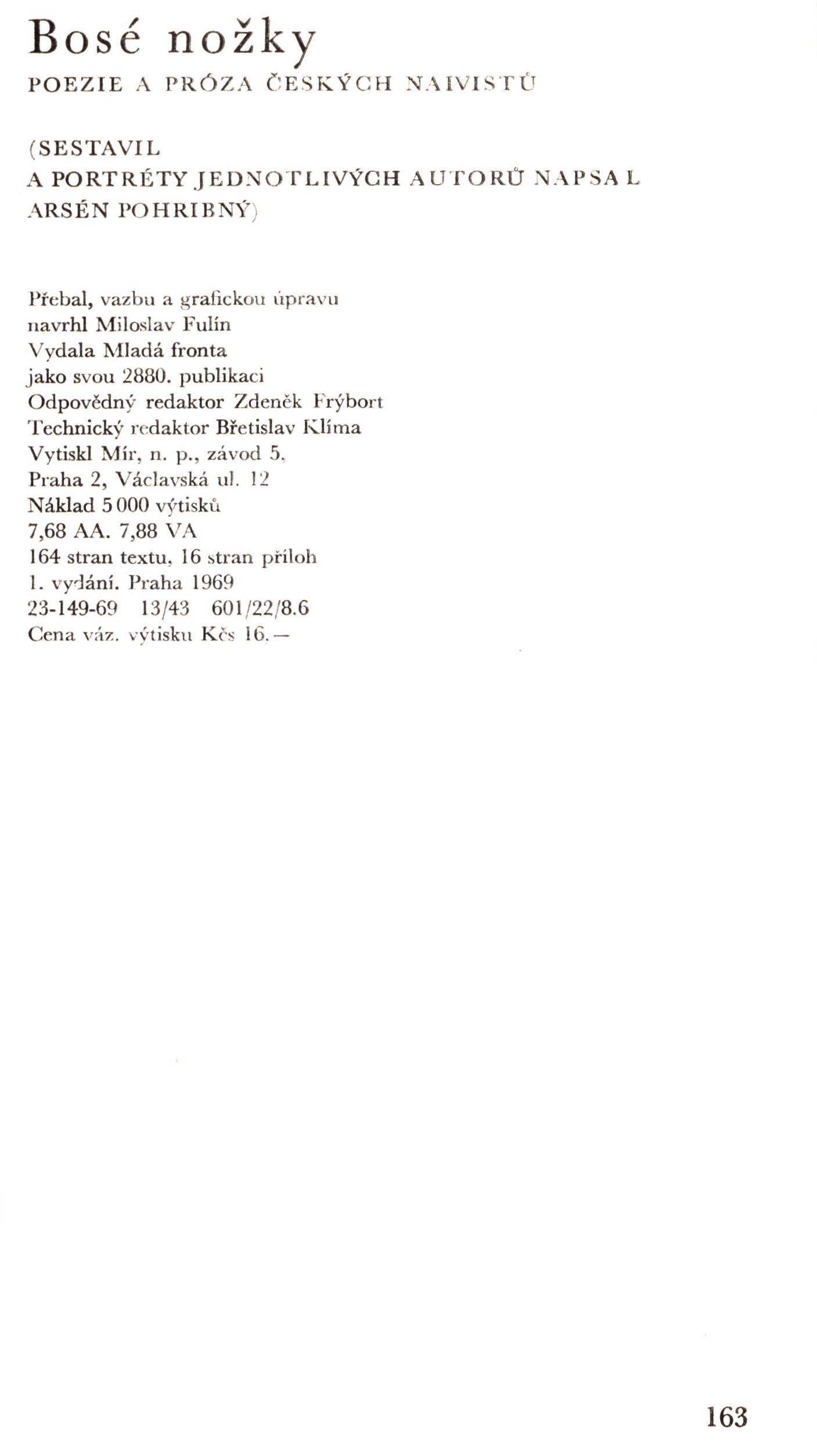1. Názvové údajeBosé nožky : poezie a próza českých naivistů / sestavil a portréty jednotlivých autorů napsal Arsén Pohribný ; přebal, vazbu a grafickou úpravu navrhl Miroslav Fulín