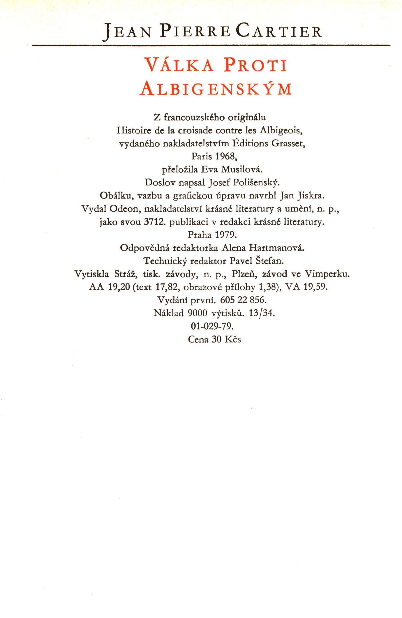 1. Názvové údajeVálka proti Albigenským / Jean Pierre Cartier ; Z francouzského originálu Histoire de la croisade contre les Albigeois ... přeložila Eva Musilová ; doslov napsal Josef Polišenský ; obálku, vazbu a grafickou úpravu navrhl Jan Jiskra