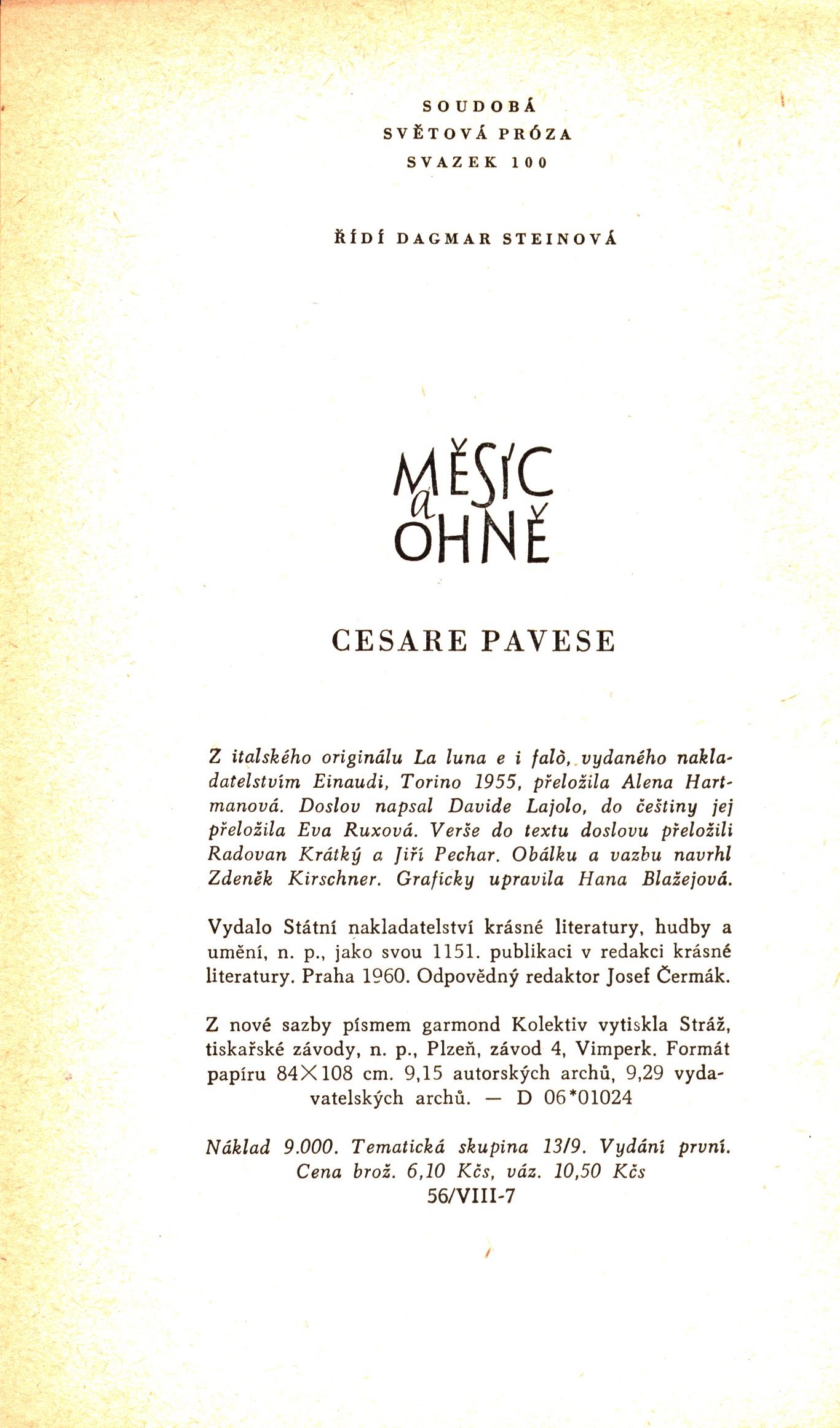 1. Názvové údajeMěsíc a ohně / Cesare Pavese ; z italského originálu La luna e i falo ... přeložila Alena Hartmanová ; doslov napsal Davide Lajolo ; do češtiny jej přeložila Eva Ruxová ; verše do textu doslovu přeložili Radovan Krátký a Jiří Pechar ; obálku a vazbu navrhl Zdeněk Kirschner ; graficky upravila Hana Blažejová