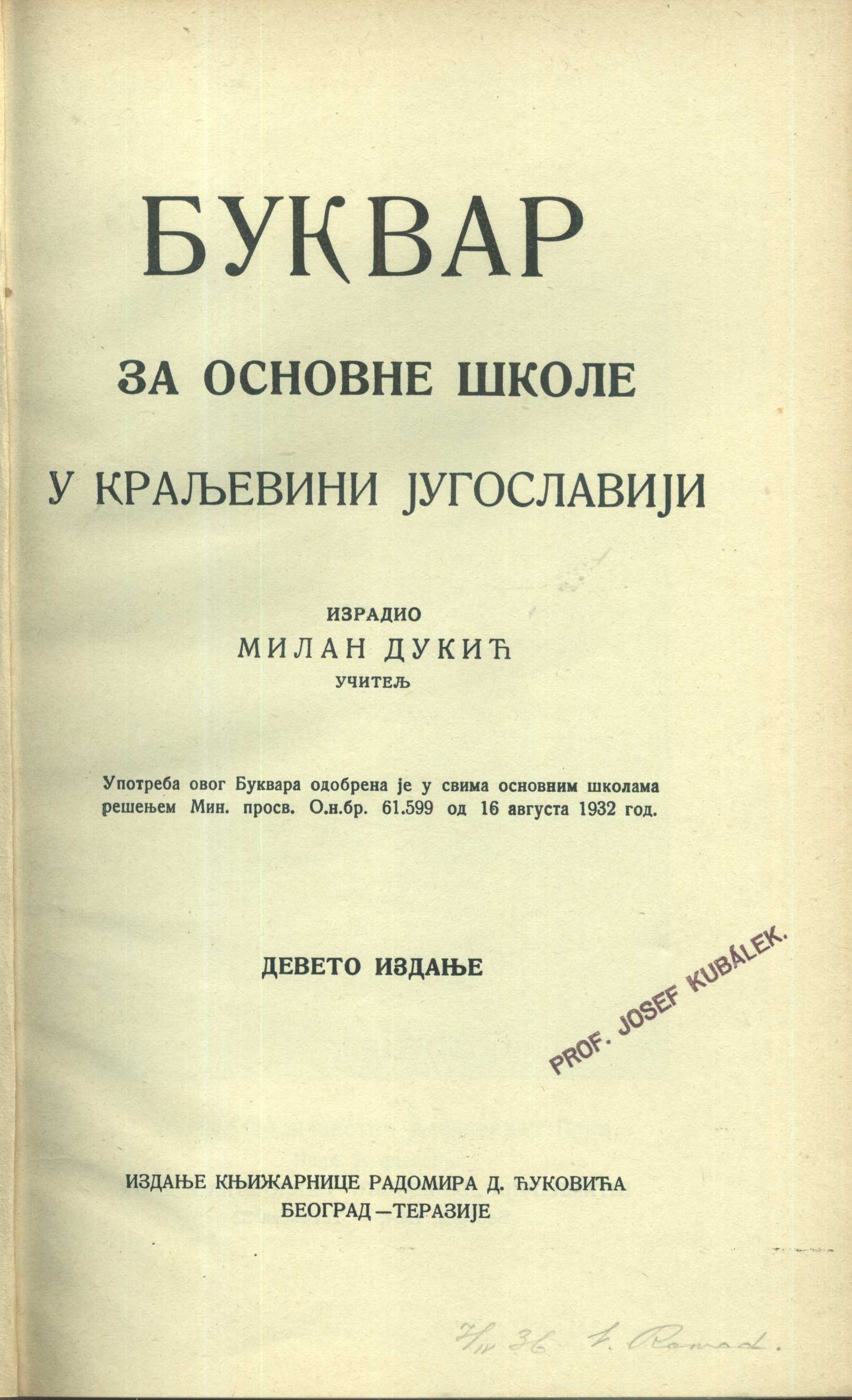 1. Názvové údajeBukvar za osnovne škole u Kraljevini Jugoslaviji / izradio Milan Dukić