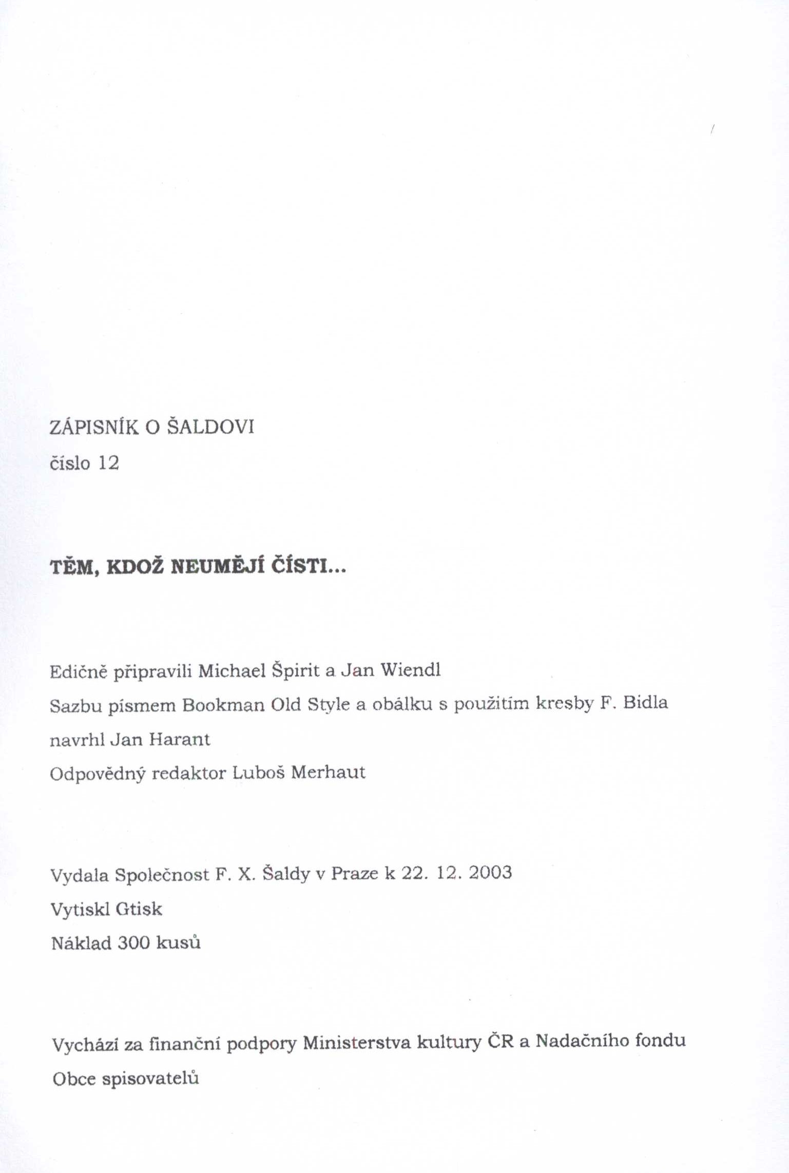 1. Názvové údajeTěm, kdož neumějí čísti... / edičně připravili Michael Špirit a Jan Wiendl ; sazbu ... a obálku s použitím kresby F. Bidla navrhl Jan Harant