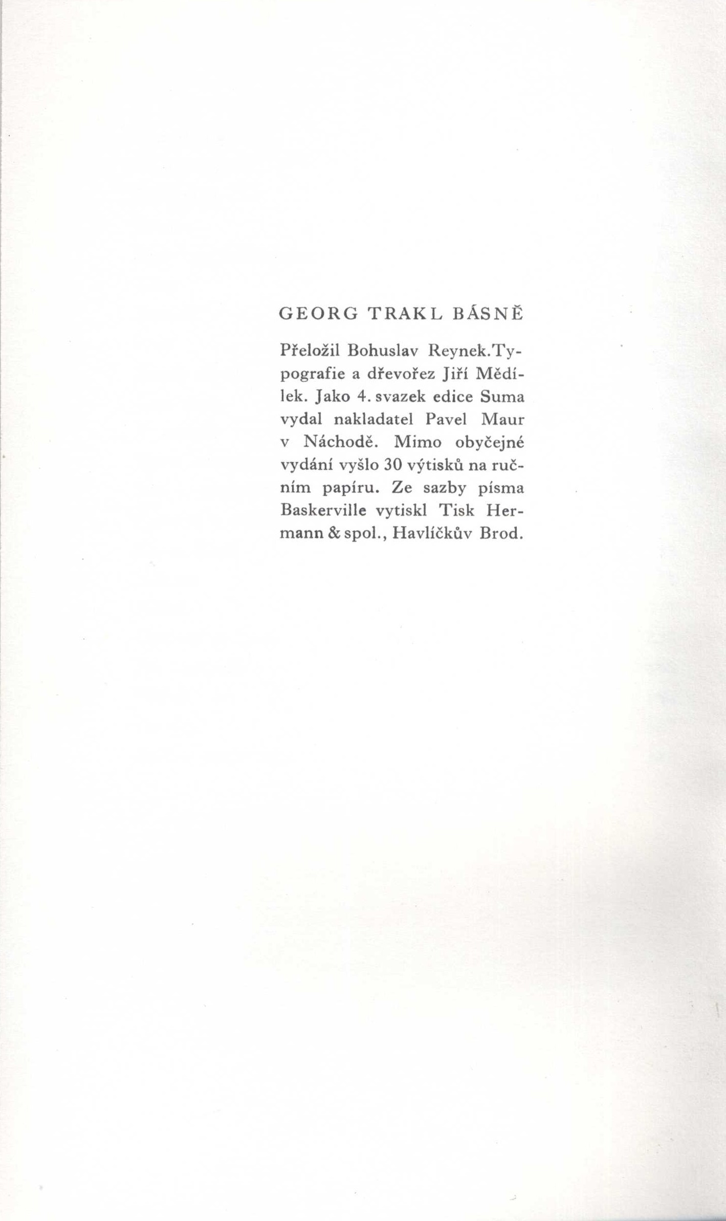 Názvové údajeBásně / Georg Trakl ; přeložil Bohuslav Reynek