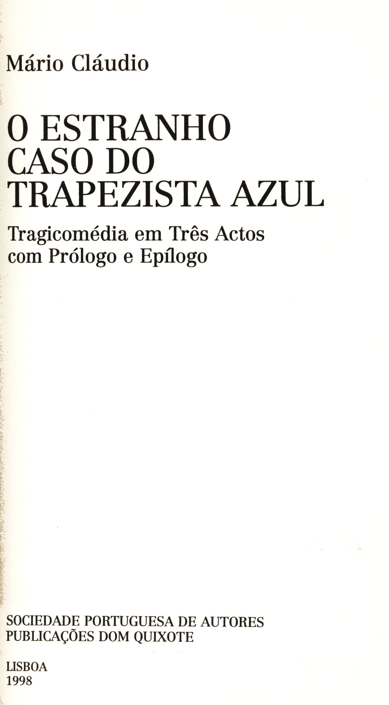 1. Názvové údajeO estranho caso do trapezista azul : tragicomédia em três actos com prólogo e epílogo / Mário Cláudio
