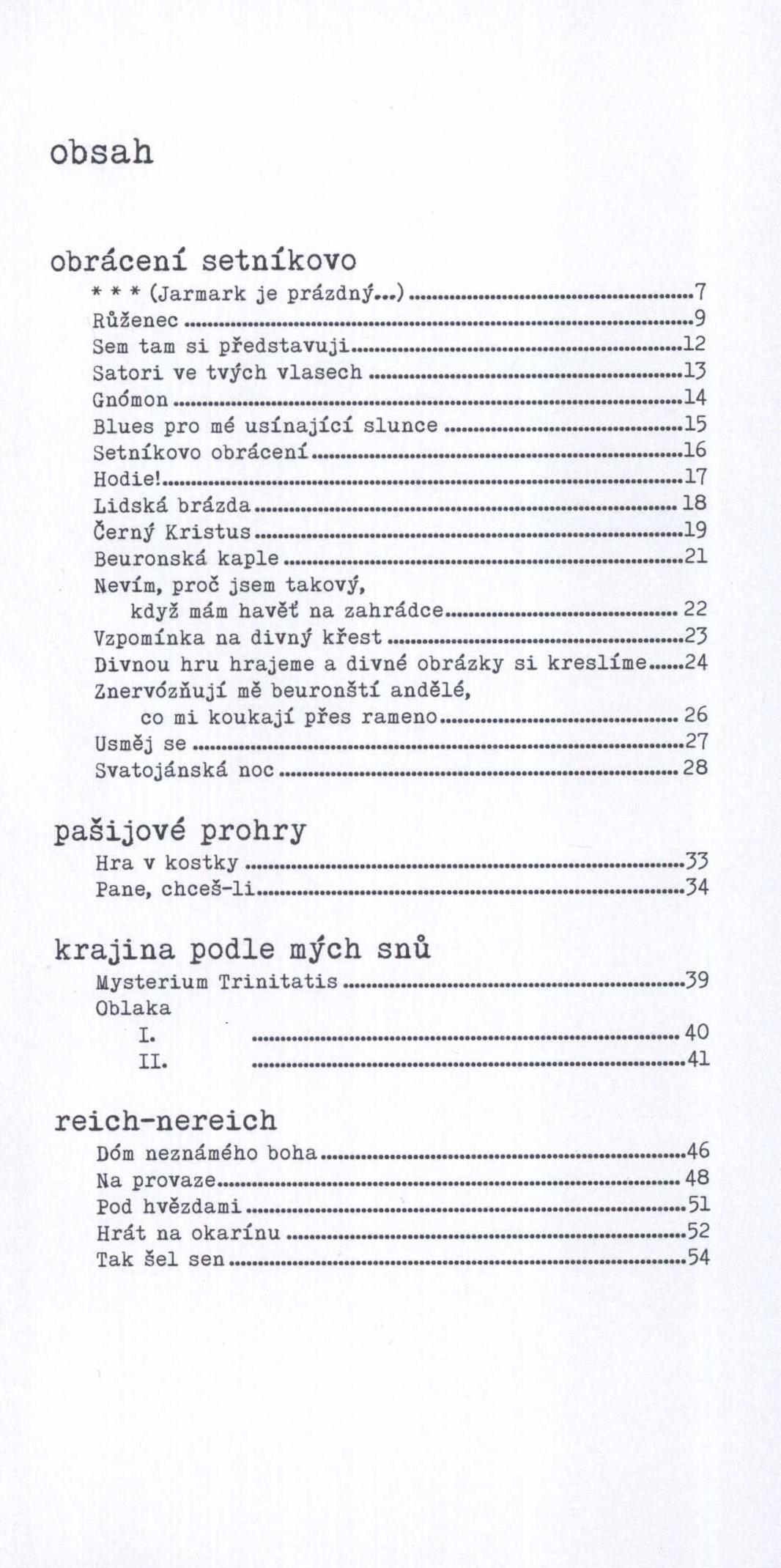 Názvové údaje La Bible : Premier et Deuxième Livre des Rois / Émile Osty et Joseph Trinquet Osobní jméno Osty, Émile, 1887-1981 (Autor) Další autoři Trinquet, Joseph, 1919-2001 (Autor) Berrar, E. (Tiskař) Korp. Éditions Rencontre (Nakladatel, vydavatel) Unifikovaný název Non nobis, Domine, (Královské knihy) Nakladatel Paris : Éditions Rencontre, 1970 Výrobce E. Berrar Rozsah 330 stran, 40 stran obrazové přílohy : ilustrace ; 20 cm Klíčová slova komentované vydání * Bible * biblistika * náboženství Počet ex. 1, z toho volných 1 Druh dok. monografie Signatura JVladislav 1843 Názvové údaje Obrácení setníkovo ; Pašijové prohry ; Krajina podle mých snů ; Reich-neReich / Felix Zöllner ; k vydání připravil Prokop Zapletal ; ilustrace Mark Ther Osobní jméno Zöllner, Felix, 1989- (Autor) Další autoři Zöllner, Felix, 1989- Obrácení setníkovo Zöllner, Felix, 1989- Pašijové prohry Zöllner, Felix, 1989- Krajina podle mých snů Zöllner, Felix, 1989- Reich-neReich Zapletal, Prokop, 2000- (Editor) Ther, Marek, 1977- (Ilustrátor) Korp. Královské knihy (nakladatelství) (Nakladatel, vydavatel) Tiskárna Broumov (Tiskař) Nakladatel Praha : Královské knihy, 2022 Výrobce Broumov : Tiskárna Broumov Rozsah 55 stran : ilustrace ; 19 cm Klíčová slova česká literatura * poezie * sbírka básní * víra Počet ex. 1, z toho volných 1 Druh dok. monografie Signatura LITb 01595
