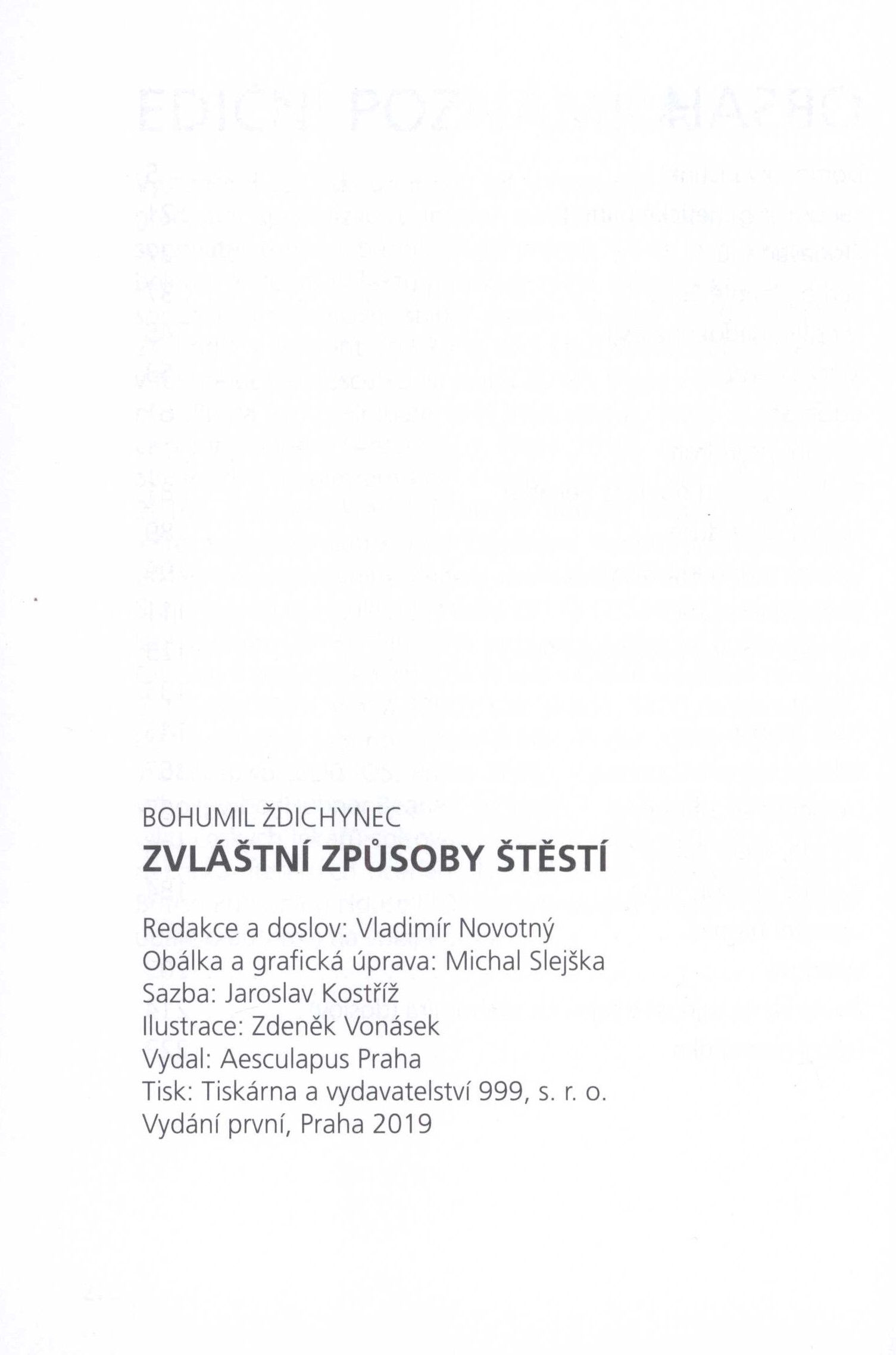 Názvové údaje Zvláštní způsoby štěstí / Bohumil Ždichynec ; doslov: Vladimír Novotný ; obálka a grafická úprava: Michal Slejška ; ilustrace: Zdeněk Vonásek Osobní jméno Ždichynec, Bohumil, 1942- (Autor) Další autoři Novotný, Vladimír, 1946- (Autor doslovu, tiráže atd.) Slejška, Michal, 1959- (Autor obálky) (Knižní grafik) Vonásek, Zdeněk, 1936- (Ilustrátor) Korp. Aesculapus (nakladatelství) (Nakladatel, vydavatel) Tiskárna a vydavatelství 999 s.r.o. (Tiskař) Nakladatel Praha : Aesculapus, 2019 Výrobce [Pelhřimov] : Tiskárna a vydavatelství 999, s. r. o. Rozsah 222 stran : ilustrace ; 21 cm Klíčová slova česká literatura * próza * povídky * štěstí Počet ex. 1, z toho volných 1 Druh dok. monografie Signatura LITb 00247 Názvové údaje Magické eupnoe : kdo jsme a kam jdeme? / Bohumil Ždichynec ; ilustrace: Martin Došek Osobní jméno Ždichynec, Bohumil, 1942- (Autor) Další autoři Došek, Martin, 1967- (Ilustrátor) Kostříž, Jaroslav (Autor obálky) Novotný, Vladimír, 1946- (Autor doslovu, tiráže atd.) Korp. Aesculapus (nakladatelství) (Nakladatel, vydavatel) Typodesign (firma) (Tiskař) Nakladatel Praha : Aesculapus, 2024 Výrobce České Budějovice : Typodesign, s.r.o. Rozsah 126 stran : ilustrace ; 21 cm Klíčová slova česká literatura * česká próza * povídky * psychologie * fyziologie * lékařství * alternativní kultura * magie * mystika * parapsychologie * stol. 21. Počet ex. 1, z toho volných 1 Druh dok. monografie Signatura LITb 02484 Názvové údaje Noe odpočítává dny / Bohumil Ždichynec ; ilustrace a obálku navrhl Michal Slejška ; redakce a doslov Vladimír Novotný Osobní jméno Ždichynec, Bohumil, 1942- (Autor) Další autoři Slejška, Michal, 1959- (Ilustrátor) (Autor obálky) Novotný, Vladimír, 1946- (Redaktor, výkonný redaktor) (Autor doslovu, tiráže atd.) Korp. Aesculapus (nakladatelství) (Nakladatel, vydavatel) Tiskárna a vydavatelství 999 s.r.o. (Tiskař) Nakladatel Praha : Aesculapus, 2020 Výrobce Tiskárna a vydavatelství 999, s.r.o. Rozsah 135 stran : ilustrace ; 21 cm Klíčová slova česká poezie * verše * deníkové záznamy Počet ex. 1, z toho volných 1 Druh dok. monografie Signatura LITb 00769 Názvové údaje Pozapomenutý Jihočech : život a dílo Jiřího Mařánka / Bohumil Ždichynec, Vladimír Novotný Osobní jméno Ždichynec, Bohumil, 1942- (Autor) (Ilustrátor) Další autoři Novotný, Vladimír, 1946- (Autor) Korp. Aesculapus (nakladatelství) (Nakladatel, vydavatel) Typodesign (firma) (Tiskař) Nakladatel Praha : Aesculapus, 2024 Výrobce České Budějovice : Typodesign, s.r.o. Rozsah 114 stran : ilustrace (převážně barevné), portréty, faksimile ; 25 cm Osobní hesla Mařánek, Jiří, 1891-1959 - prozaik, dramatik, esejista, filmový scenárista, libretista Klíčová slova čeští spisovatelé * regionální autoři * osobnosti regionu * osobnosti kultury * jižní Čechy * biografie * stol. 20., 1. pol. Počet ex. 1, z toho volných 1 Druh dok. monografie Signatura LITc 0807 Názvové údaje Stradivárky z vinylu : přežijeme osud? / Bohumil Ždichynec ; redakce a doslov: Vladimír Novotný ; obálka a předsádky: Jaroslav Kostříž (s použitím kresby Claudi Ondok) ; ilustrace: Claudi Ondok Osobní jméno Ždichynec, Bohumil, 1942- (Autor) Další autoři Novotný, Vladimír, 1946- (Redaktor, výkonný redaktor) (Autor doslovu, tiráže atd.) Kostříž, Jaroslav (Autor obálky) (Knižní grafik) Ondok, Claudi, 1993- (Ilustrátor) Korp. Aesculapus (nakladatelství) (Nakladatel, vydavatel) Typodesign (firma) (Tiskař) Nakladatel Praha : Aesculapus, 2024 Výrobce České Budějovice : Typodesign, s.r.o. Rozsah 102 stran : ilustrace ; 21 cm Klíčová slova česká literatura * poezie * básnická sbírka * člověk * životní poslání * současný svět Počet ex. 1, z toho volných 1 Druh dok. monografie Signatura LITb 02487