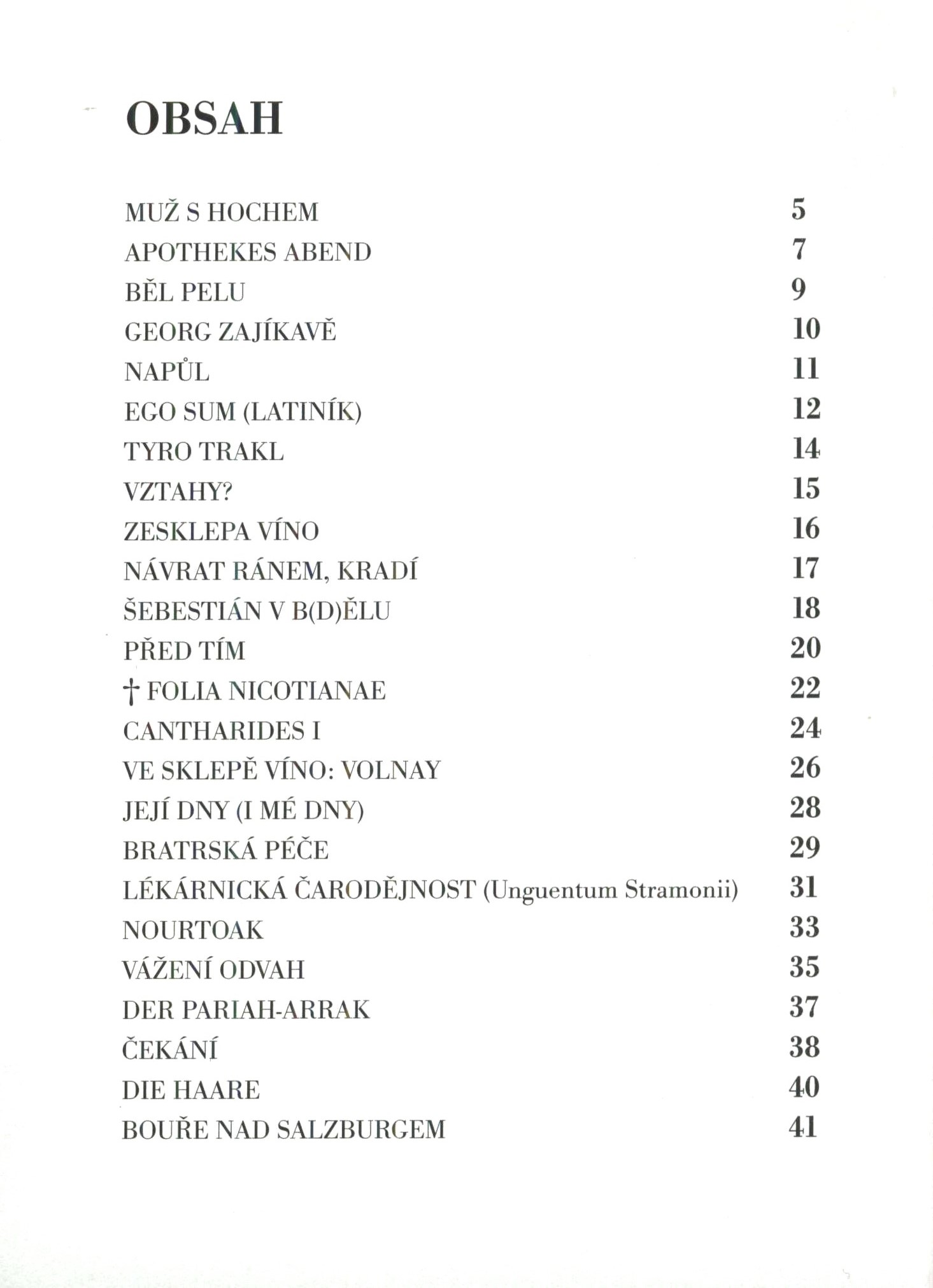 Názvové údaje Až mě vypálí slunce / Klára Machů ; ilustrace na obálce detail obrazu Jiřího Vovsa ; grafická úprava, sazba, fotografie autorky a výroba ... Dobrý důvod Osobní jméno Machů, Klára, 1988- (Autor) Další autoři Voves, Jiří, 1945- (Ilustrátor) Korp. Dobrý důvod (nakladatelství, grafické studio) (Knižní grafik) (Sazeč) (Fotograf) (Nakladatel, vydavatel) Books Factory (Štětín, Polsko) (Tiskař) Nakladatel [Nová Říše] : Dobrý důvod, 2025 Výrobce Szczecin : Books Factory Rozsah 79 stran ; 15 cm Klíčová slova česká poezie * básně * sbírka básní Počet ex. 1, z toho volných 1 Druh dok. monografie Signatura LITa 0639 Názvové údaje Barchoviny / Petr Šmíd ; na obálce detail obrazu Jana Pražana Trávy I. s typografií Bohuslava Šíra ; grafická úprava, sazba, foto autora a výroba ... Dobrý důvod Osobní jméno Šmíd, Petr, 1985- (Autor) Další autoři Pražan, Jan, 1979- (Umělec) Šír, Bohuslav, 1956- (Typograf) Korp. Dobrý důvod (nakladatelství, grafické studio) (Knižní grafik) (Sazeč) (Fotograf) (Nakladatel, vydavatel) Books Factory (Štětín, Polsko) (Tiskař) Nakladatel [Nová Říše] : Dobrý důvod, 2024 Výrobce Szczecin : Books Factory Rozsah 53 stran : 1 portrét ; 15 cm Klíčová slova česká poezie * básně * sbírka básní Počet ex. 1, z toho volných 1 Druh dok. monografie Signatura LITa 0509 Názvové údaje City, slóvce / Olga Słowik ; fotografie Dirk Skiba ; grafická úprava, sazba a výroba ... Dobrý důvod Osobní jméno Słowik, Olga, 1990- (Autor) Další autoři Skiba, Dirk, 1963- (Fotograf) Korp. Dobrý důvod (nakladatelství, grafické studio) (Knižní grafik) (Sazeč) (Nakladatel, vydavatel) Books Factory (Štětín, Polsko) (Tiskař) Nakladatel [Nová Říše] : Dobrý důvod, 2025 Výrobce Szczecin : Books Factory Rozsah 70 stran : 1 portrét ; 18 cm Klíčová slova česká poezie * básně * sbírka básní Počet ex. 1, z toho volných 1 Druh dok. monografie Signatura LITa 0627 Názvové údaje Dospávám úplněk / Zdeněk Volf ; ilustrace Petr Čermáček ; grafická úprava, obálka, sazba, fotografie a výroba ... Dobrý důvod Osobní jméno Volf, Zdeněk, 1957- (Autor) Další autoři Čermáček, Petr, 1972- (Ilustrátor) Korp. Dobrý důvod (nakladatelství, grafické studio) (Knižní grafik) (Autor obálky) (Sazeč) (Fotograf) (Nakladatel, vydavatel) Books Factory (Štětín, Polsko) (Tiskař) Nakladatel [Nová Říše] : Dobrý důvod, 2025 Výrobce Szcecin : Books Factory Rozsah 75 stran : ilustrace ; 13 cm Klíčová slova česká poezie * básně * sbírka poezie Počet ex. 1, z toho volných 1 Druh dok. monografie Signatura LITa 0678 Názvové údaje Hodiny / Slavomír Kudláček ; ilustrace na obálce detail obrazu Jiřího Vovsa ; redakce, grafická úprava, fotografie, sazba a výroba ... Dobrý důvod Osobní jméno Kudláček, Slavomír, 1954- (Autor) Další autoři Voves, Jiří, 1945- (Ilustrátor) Korp. Dobrý důvod (nakladatelství, grafické studio) (Redaktor, výkonný redaktor) (Knižní grafik) (Autor obálky) (Fotograf) (Sazeč) (Nakladatel, vydavatel) Books Factory (Štětín, Polsko) (Tiskař) Nakladatel [Nová Říše] : Dobrý důvod, 2025 Výrobce Szczecin : Books Factory Rozsah 61 stran : 1 portrét ; 18 cm Klíčová slova česká poezie * básně * sbírka básní Počet ex. 1, z toho volných 1 Druh dok. monografie Signatura LITb 02934 Názvové údaje Hrobařův syn / Rostislav Šíma ; ilustrace Petr Drápela ; typografie obálky Bohuslav Šír Osobní jméno Šíma, Rostislav, 1992- (Autor) Další autoři Drápela, Petr (Ilustrátor) Šír, Bohuslav, 1956- (Typograf) Korp. Dobrý důvod (nakladatelství, grafické studio) (Knižní grafik) Spolek přátel umění města Kunštát (Nakladatel, vydavatel) Books Factory (Štětín, Polsko) (Tiskař) Nakladatel [Nová Říše] : Dobrý důvod, 2022 Výrobce Szczecin : Books Factory Rozsah 46 stran : ilustrace ; 18 cm Klíčová slova česká poezie * básně * sbírka básní Počet ex. 1, z toho volných 1 Druh dok. monografie Signatura LITa 0370 Názvové údaje Inge si pomyslela, že je to vlastně smutné / Sigmius Xerodoth ; ilustrace Marie Novotná ; grafická úprava, sazba a výroba ... Dobrý důvod Osobní jméno Sigmius, Xerodoth, 1995- (Autor) Další autoři Novotná, Marie, 1992- (Ilustrátor) Korp. Dobrý důvod (nakladatelství, grafické studio) (Knižní grafik) (Sazeč) (Nakladatel, vydavatel) Books Factory (Štětín, Polsko) (Tiskař) Nakladatel [Nová Říše] : Dobrý důvod, 2024 Výrobce Szczecin : Books Factory Rozsah 105 stran : ilustrace ; 15 cm Klíčová slova česká próza * české novely Počet ex. 1, z toho volných 1 Druh dok. monografie Signatura LITa 0578 Názvové údaje Jak vrabec na šlahounu svlačce / Anna Gažiová ; typografie na obálce Bohuslav Šír ; grafická úprava, sazba, výroba Dobrý důvod Osobní jméno Gažiová, Anna, 1999- (Autor) Další autoři Šír, Bohuslav, 1956- (Typograf) Korp. Dobrý důvod (nakladatelství, grafické studio) (Knižní grafik) Books Factory (Štětín, Polsko) (Tiskař) Nakladatel [Nová Říše] : Dobrý důvod, 2022 Výrobce Szczecin : Books Factory Rozsah 44 stran ; 15 cm Klíčová slova česká poezie * básně * sbírka básní * r. 2016-2022 Počet ex. 1, z toho volných 1 Druh dok. monografie Signatura LITa 0369 Názvové údaje Der Kollege / Jiří Staněk ; ilustrace na obálce Vojtěch Preissig: Tapeta, Volné směry 1903 ; grafická úprava, sazba, foto autora a výroba ... publikace Dobrý důvod Osobní jméno Staněk, Jiří, 1957 únor 23.- (Autor) Další autoři Preissig, Vojtěch, 1873-1944 (Umělec) (Ilustrátor) Korp. Dobrý důvod (nakladatelství, grafické studio) (Knižní grafik) (Sazeč) (Fotograf) (Nakladatel, vydavatel) Books Factory (Štětín, Polsko) (Tiskař) Nakladatel [Nová Říše] : Dobrý důvod, 2025 Výrobce Szczecin : Books Factory Rozsah 77 stran : 1 po